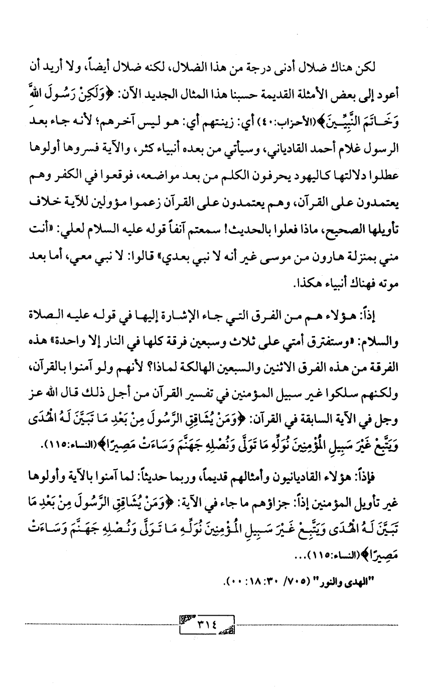 لكن هناك ضلال أدنى درجة من هذا الضلال، لكنه ضلال أيضاً، ولا أريد أن أعود إلى بعض الأمثلة القديمة حسبنا هذا المثال الجديد الآن: {وَلَكِنْ رَسُولَ اللَّهِ وَخَاتَمَ النَّبِيِّينَ} (الأحزاب:40) أي: زينتهم أي: هو ليس آخرهم؛ لأنه جاء بعد الرسول غلام أحمد القادياني، وسيأتي من بعده أنبياء كثر، والآية فسروها أولوها عطلوا دلالتها كاليهود يحرفون الكلم من بعد مواضعه، فوقعوا في الكفر وهم يعتمدون على القرآن، وهم يعتمدون على القرآن زعموا مؤولين للآية خلاف تأويلها الصحيح، ماذا فعلوا بالحديث! سمعتم آنفاً قوله عليه السلام لعلي: «أنت مني بمنزلة هارون من موسى غير أنه لا نبي بعدي» قالوا: لا نبي معي، أما بعد موته فهناك أنبياء هكذا.