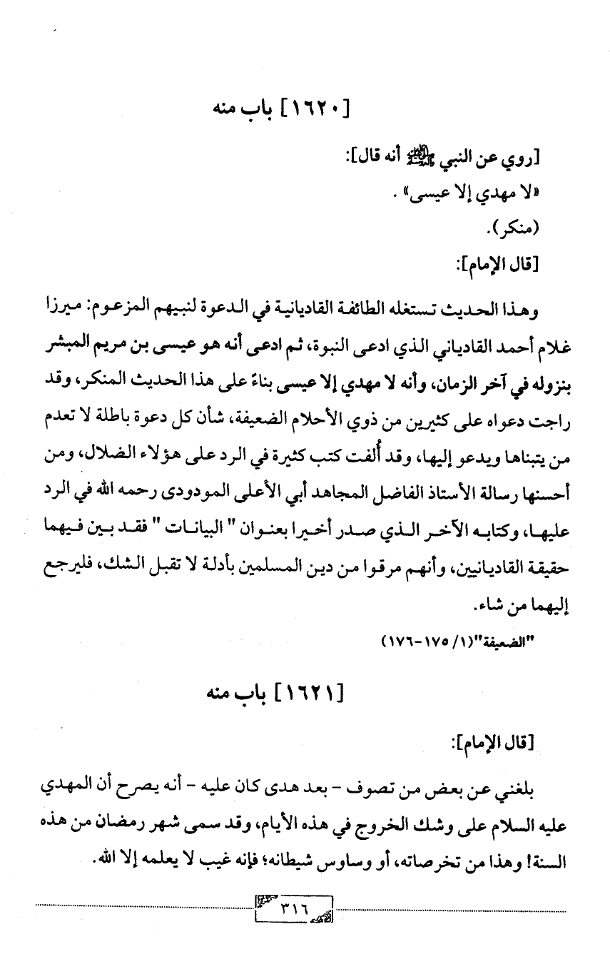 وهذا الحديث تستغله الطائفة القاديانية في الدعوة لنبيهم المزعوم: ميرزا غلام أحمد القادياني الذي ادعى النبوة، ثم ادعى أنه هو عيسى بن مريم المبشر بنزوله في آخر الزمان، وأنه لا مهدي إلا عيسى بناءً على هذا الحديث المنكر، وقد راجت دعواه على كثيرين من ذوي الأحلام الضعيفة، شأن كل دعوة باطلة لا تعدم من يتبناها ويدعو إليها، وقد أُلفت كتب كثيرة في الرد على هؤلاء الضلال، ومن أحسنها رسالة الأستاذ الفاضل المجاهد أبي الأعلى المودودى رحمه الله في الرد عليها، وكتابه الآخر الذي صدر أخيرا بعنوان " البيانات " فقد بين فيهما