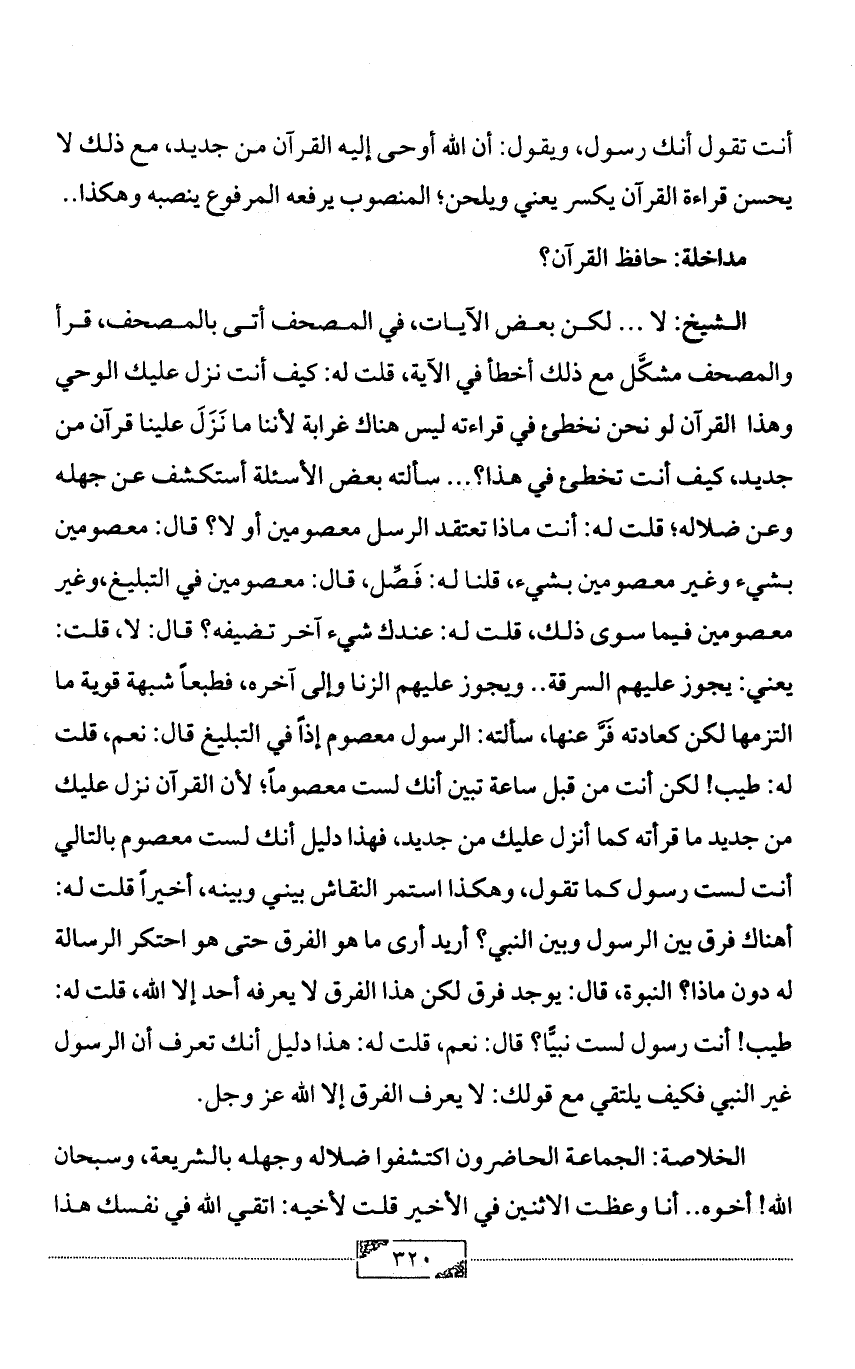 الشيخ: لا ... لكن بعض الآيات، في المصحف أتى بالمصحف، قرأ والمصحف مشكَّل مع ذلك أخطأ في الآية، قلت له: كيف أنت نزل عليك الوحي وهذا القرآن لو نحن نخطئ في قراءته ليس هناك غرابة لأننا ما نَزَلَ علينا قرآن من جديد، كيف أنت تخطئ في هذا؟ ... سألته بعض الأسئلة أستكشف عن جهله وعن ضلاله؛ قلت له: أنت ماذا تعتقد الرسل معصومين أو لا؟ قال: معصومين بشيء وغير معصومين بشيء، قلنا له: فَصِّل، قال: معصومين في التبليغ، وغير معصومين فيما سوى ذلك، قلت له: عندك شيء آخر تضيفه؟ قال: لا، قلت: يعني: يجوز عليهم السرقة .. ويجوز عليهم الزنا وإلى آخره، فطبعاً شبهة قوية ما التزمها لكن كعادته فَرَّ عنها، سألته: الرسول معصوم إذاً في التبليغ قال: نعم، قلت له: طيب! لكن أنت من قبل ساعة تبين أنك لست معصوماً؛ لأن القرآن نزل عليك من جديد ما قرأته كما أنزل عليك من جديد، فهذا دليل أنك لست معصوم بالتالي أنت لست رسول كما تقول، وهكذا استمر النقاش بيني وبينه، أخيراً قلت له: أهناك فرق بين الرسول وبين النبي؟ أريد أرى ما هو الفرق حتى هو احتكر الرسالة له دون ماذا؟ النبوة، قال: يوجد فرق لكن هذا الفرق لا يعرفه أحد إلا الله، قلت له: طيب! أنت رسول لست نبيًّا؟ قال: نعم، قلت له: هذا دليل أنك تعرف أن الرسول غير النبي فكيف يلتقي مع قولك: لا يعرف الفرق إلا الله عز وجل.