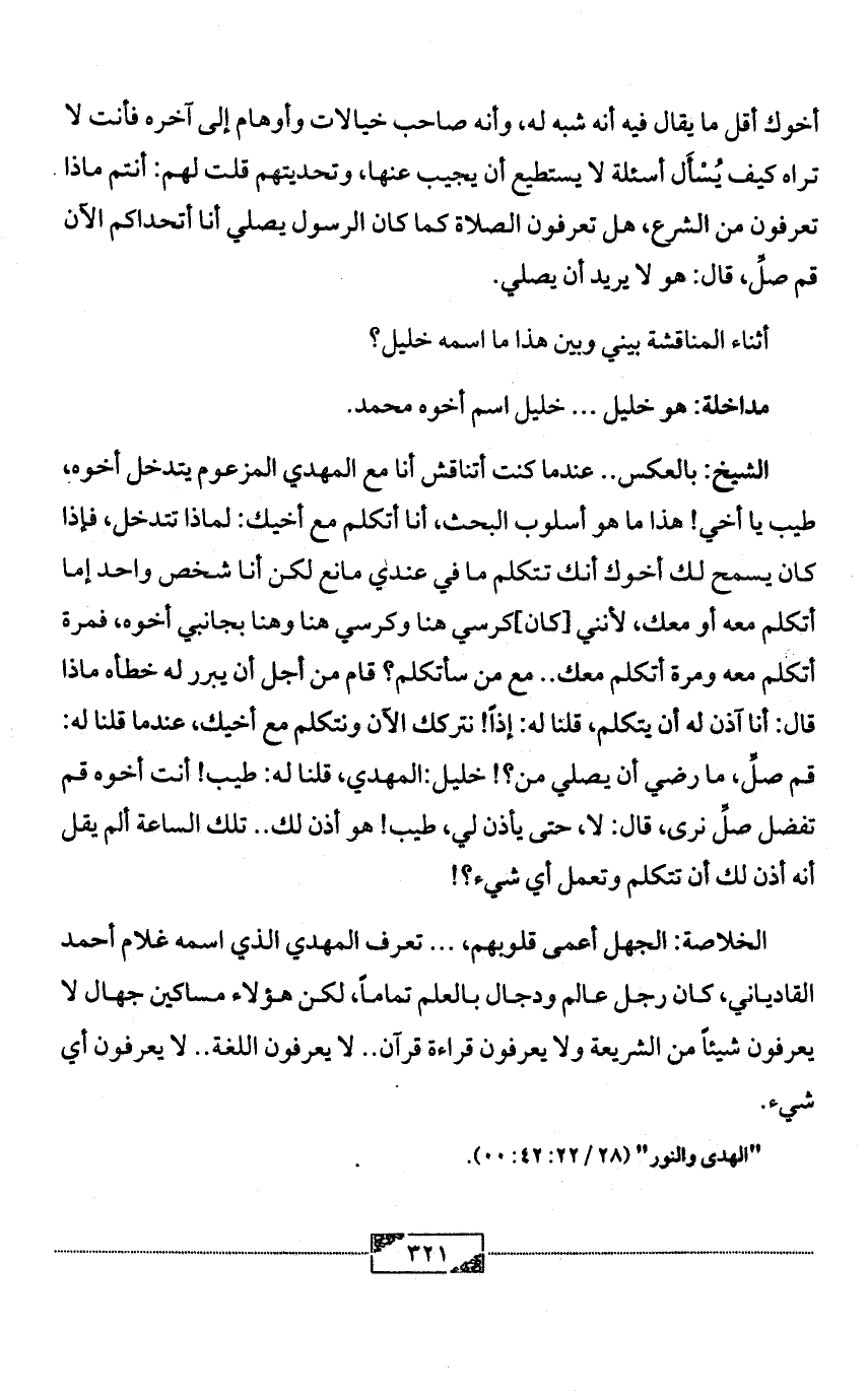 الشيخ: بالعكس .. عندما كنت أتناقش أنا مع المهدي المزعوم يتدخل أخوه، طيب يا أخي! هذا ما هو أسلوب البحث، أنا أتكلم مع أخيك: لماذا تتدخل، فإذا كان يسمح لك أخوك أنك تتكلم ما في عندي مانع لكن أنا شخص واحد إما أتكلم معه أو معك، لأنني [كان] كرسي هنا وكرسي هنا وهنا بجانبي أخوه، فمرة أتكلم معه ومرة أتكلم معك .. مع من سأتكلم؟ قام من أجل أن يبرر له خطأه ماذا قال: أنا آذن له أن يتكلم، قلنا له: إذاً! نتركك الآن ونتكلم مع أخيك، عندما قلنا له: قم صلِّ، ما رضي أن يصلي من؟! خليل: المهدي، قلنا له: طيب! أنت أخوه قم تفضل صلِّ نرى، قال: لا، حتى يأذن لي، طيب! هو أذن لك .. تلك الساعة ألم يقل أنه أذن لك أن تتكلم وتعمل أي شيء؟!