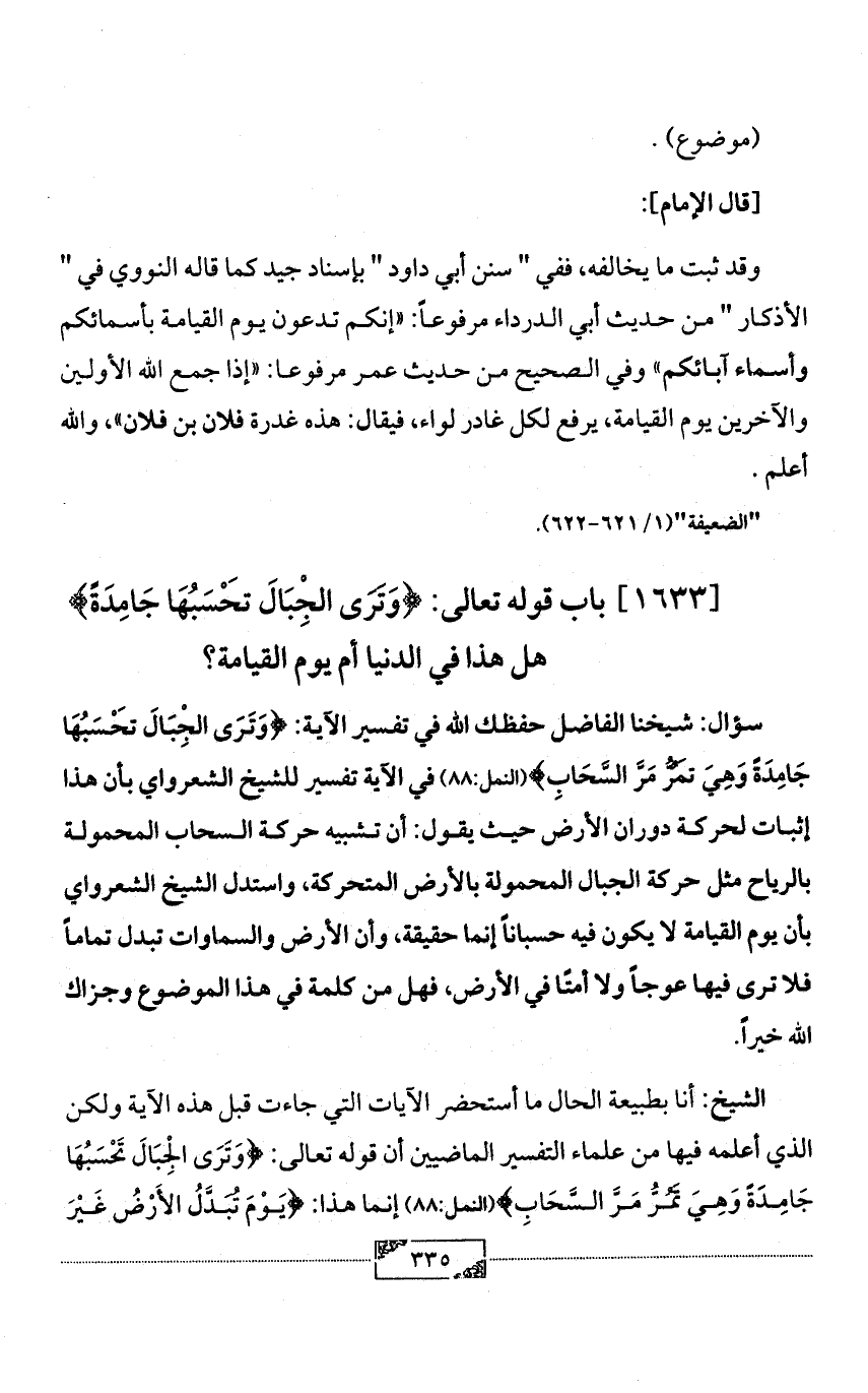 الشيخ: أنا بطبيعة الحال ما أستحضر الآيات التي جاءت قبل هذه الآية ولكن الذي أعلمه فيها من علماء التفسير الماضيين أن قوله تعالى: {وَتَرَى الْجِبَالَ تَحْسَبُهَا جَامِدَةً وَهِيَ تَمُرُّ مَرَّ السَّحَابِ} (النمل:88) إنما هذا: {يَوْمَ تُبَدَّلُ الأَرْضُ غَيْرَ