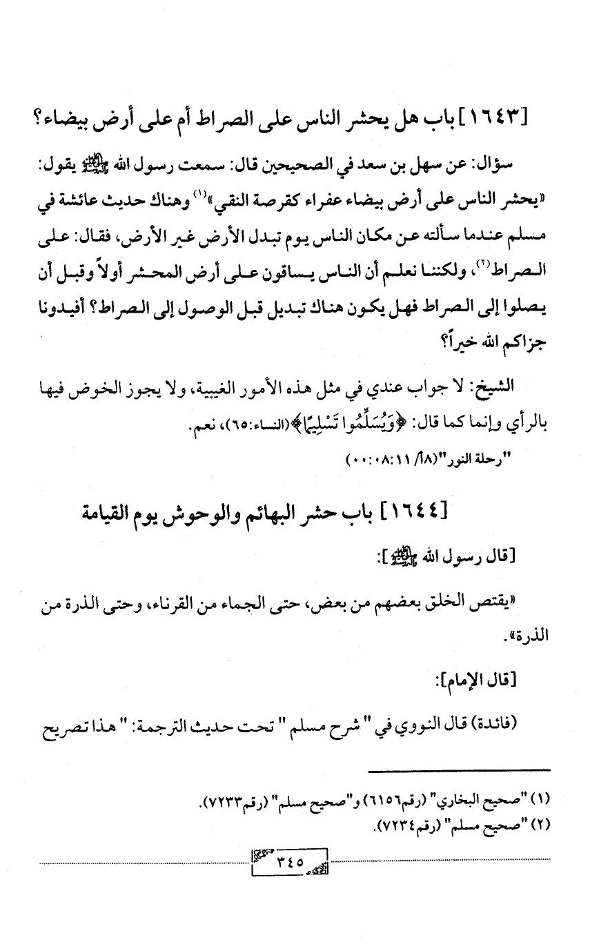 سؤال: عن سهل بن سعد في الصحيحين قال: سمعت رسول الله - صلى الله عليه وآله وسلم - يقول: «يحشر الناس على أرض بيضاء عفراء كقرصة النقي» (¬1) وهناك حديث عائشة في مسلم عندما سألته عن مكان الناس يوم تبدل الأرض غير الأرض، فقال: على الصراط (¬2)، ولكننا نعلم أن الناس يساقون على أرض المحشر أولاً وقبل أن