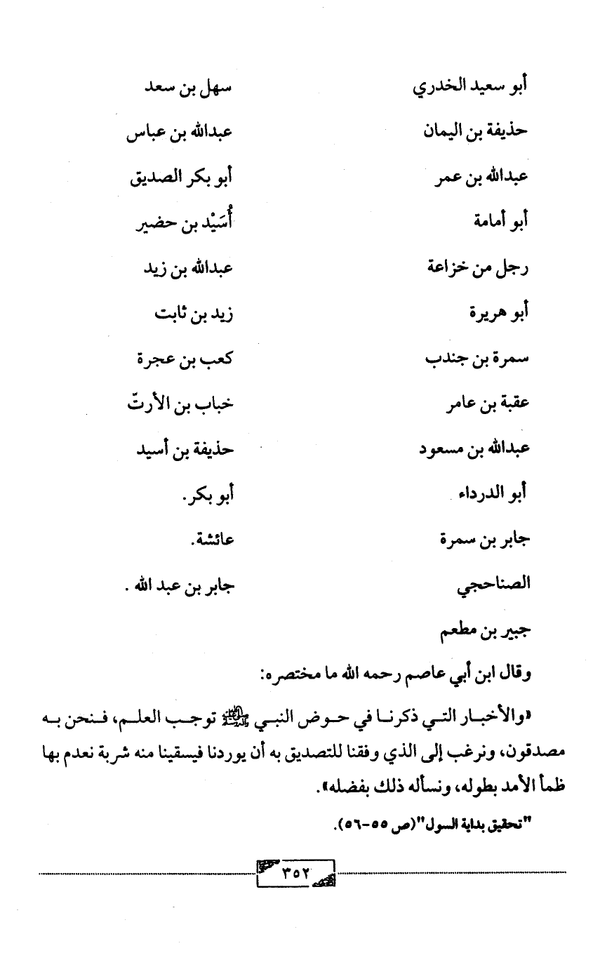 «والأخبار التي ذكرنا في حوض النبي - صلى الله عليه وآله وسلم - توجب العلم، فنحن به مصدقون، ونرغب إلى الذي وفقنا للتصديق به أن يوردنا فيسقينا منه شربة نعدم بها ظمأ الأمد بطوله، ونسأله ذلك بفضله».