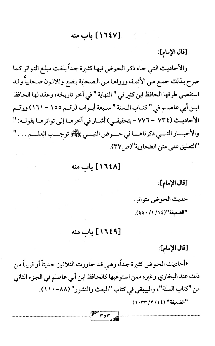 «أحاديث الحوض كثيرة جداً، وهي قد جاوزت الثلاثين حديثاً أو قريباً من ذلك عند البخاري وغيره ممن استوعبها كالحافظ ابن أبي عاصم في الجزء الثاني من "كتاب السنة"، والبيهقي في كتاب "البعث والنشور" (88 - 110).
