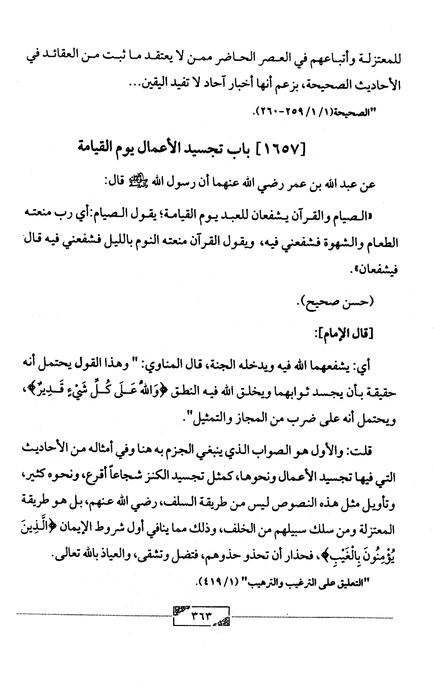 قلت: والأول هو الصواب الذي ينبغي الجزم به هنا وفي أمثاله من الأحاديث التي فيها تجسيد الأعمال ونحوها، كمثل تجسيد الكنز شجاعاً أقرع، ونحوه كثير، وتأويل مثل هذه النصوص ليس من طريقة السلف، رضي الله عنهم، بل هو طريقة المعتزلة ومن سلك سبيلهم من الخلف، وذلك مما ينافي أول شروط الإيمان {الَّذِينَ يُؤْمِنُونَ بِالْغَيْبِ}، فحذار أن تحذو حذوهم، فتضل وتشقى، والعياذ بالله تعالى.