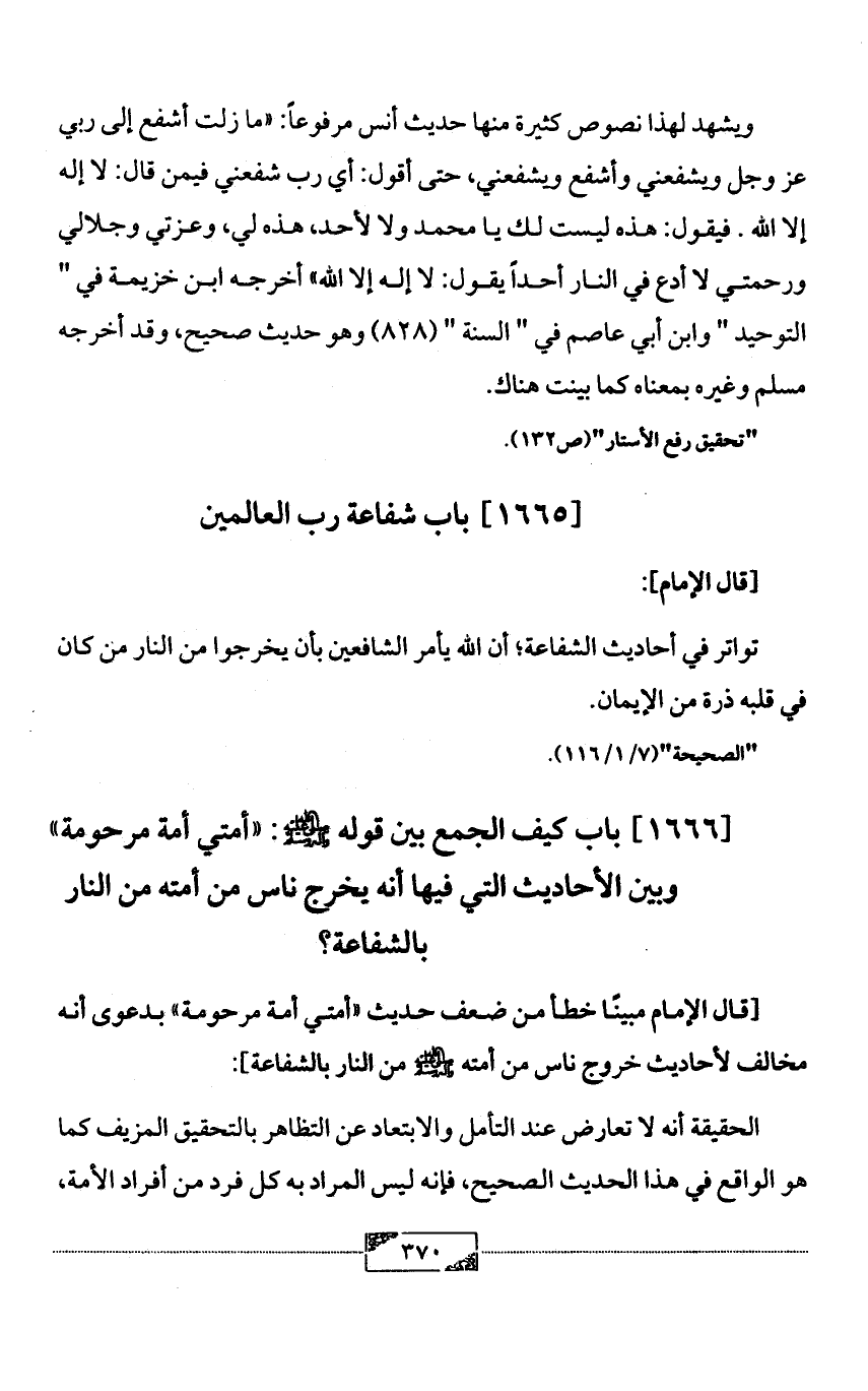 ويشهد لهذا نصوص كثيرة منها حديث أنس مرفوعاً: «ما زلت أشفع إلى ربي عز وجل ويشفعني وأشفع ويشفعني، حتى أقول: أي رب شفعني فيمن قال: لا إله إلا الله. فيقول: هذه ليست لك يا محمد ولا لأحد، هذه لي، وعزتي وجلالي ورحمتي لا أدع في النار أحداً يقول: لا إله إلا الله» أخرجه ابن خزيمة في " التوحيد " وابن أبي عاصم في " السنة " (828) وهو حديث صحيح، وقد أخرجه مسلم وغيره بمعناه كما بينت هناك.