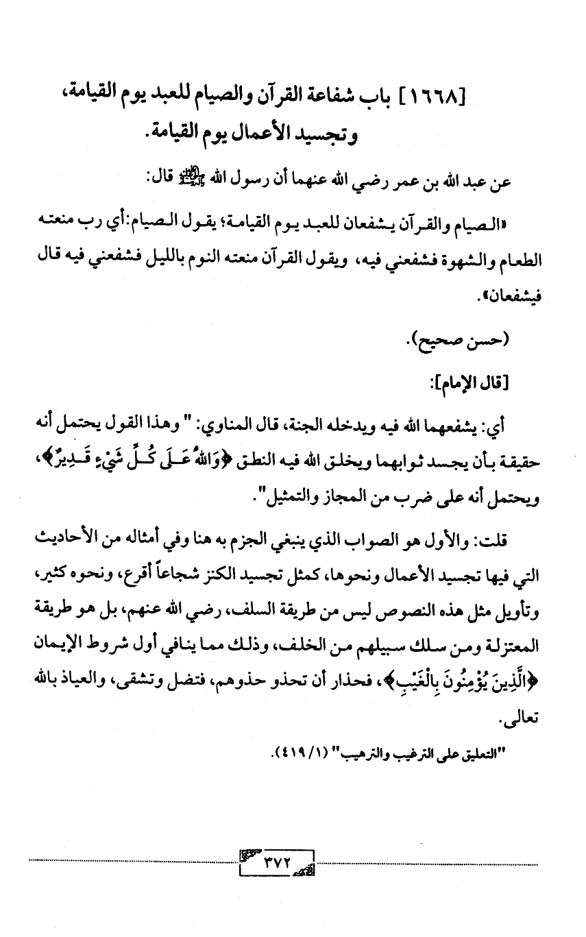 [1668] باب شفاعة القرآن والصيام للعبد يوم القيامة، وتجسيد الأعمال يوم القيامة.