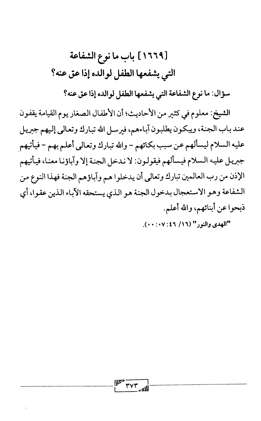 الشيخ: معلوم في كثير من الأحاديث؛ أن الأطفال الصغار يوم القيامة يقفون عند باب الجنة، ويبكون يطلبون آباءهم، فيرسل الله تبارك وتعالى إليهم جبريل عليه السلام ليسألهم عن سبب بكائهم - والله تبارك وتعالى أعلم بهم - فيأتيهم جبريل عليه السلام فيسألهم فيقولون: لا ندخل الجنة إلا وآباؤنا معنا، فيأتيهم الإذن من رب العالمين تبارك وتعالى أن يدخلوا هم وآباؤهم الجنة فهذا النوع من الشفاعة وهو الاستعجال بدخول الجنة هو الذي يستحقه الآباء الذين عقوا، أي ذبحوا عن أبنائهم، والله أعلم.