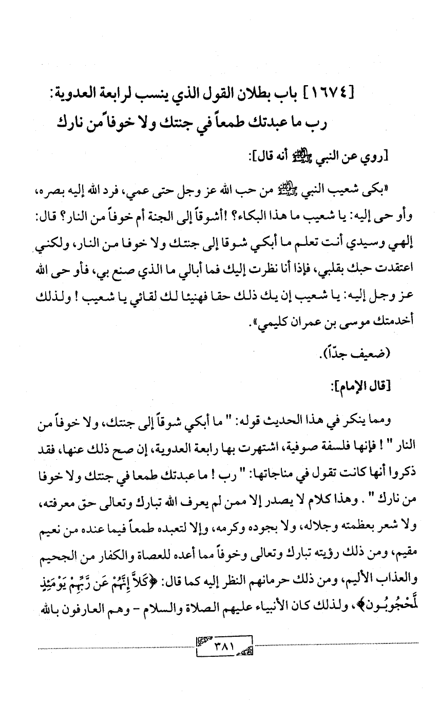 [1674] باب بطلان القول الذي ينسب لرابعة العدوية: رب ما عبدتك طمعاً في جنتك ولا خوفا ًمن نارك