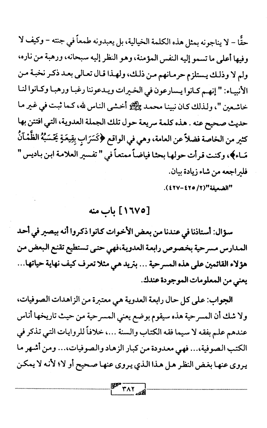 الجواب: على كل حال رابعة العدوية هي معتبرة من الزاهدات الصوفيات، ولا شك أن المسرحية هذه سيقوم بوضع يعني المسرحية من حيث تاريخها أناس عندهم علم بفقه لا سيما فقه الكتاب والسنة ... ، خلافاً للروايات التي تذكر في الكتب الصوفية، ... فهي معدودة من كبار الزهاد والصوفيات، ... ومن أشهر ما يروى عنها بغض النظر هل هذا الذي يروى عنها صحيح أو لا؛ لأنه لا يمكن