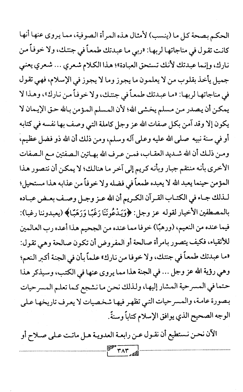 الحكم بصحة كل ما (ينسب) لأمثال هذه المرأة الصوفية، مما يروى عنها أنها كانت تقول في مناجاتها لربها: «ربي ما عبدتك طمعاً في جنتك، ولا خوفاً من نارك، وإنما عبدتك لأنك تستحق العبادة»؛ هذا الكلام شعري ... شعري يعني جميل يأخذ بقلوب من لا يعلمون ما يجوز وما لا يجوز في الإسلام، فهي تقول في مناجاتها لربها: «ما عبدتك طمعاً في جنتك، ولا خوفاً من نارك»، وهذا لا يمكن أن يصدر من مسلم يخشى الله؛ لأن المسلم المؤمن بالله حق الإيمان لا يكون إلا وقد آمن بكل صفات الله عز وجل كاملة التي وصف بها نفسه في كتابه أو في سنة نبيه صلى الله عليه وعلى آله وسلم، ومن ذلك أن الله ذو فضل عظيم، ومن ذلك أن الله شديد العقاب، فمن عرف الله بهاتين الصفتين مع الصفات الأخرى بأنه منتقم جبار وبأنه كريم إلى آخر ما هنالك؛ لا يمكن أن نتصور هذا المؤمن حينما يعبد الله لا يعبده طمعاً في فضله ولا خوفاً من عذابه هذا مستحيل؛ لذلك جاء في الكتاب القرآن الكريم أن الله عز وجل وصف بعض عباده بالمصطفين الأخيار لقوله عز وجل: {وَيَدْعُونَنَا رَغَبًا وَرَهَبًا} (يعبدوننا رغبا): فيما عنده من النعيم، (ورهبًا) خوفا مما عنده من الجحيم هذا أعده رب العالمين للأتقياء، فكيف يتصور بامرأة صالحة أو المفروض أن تكون صالحة وهي تقول: «ما عبدتك طمعاً في جنتك، ولا خوفا من نارك» علماً بأن في الجنة أكبر النعم؛ وهي رؤية الله عز وجل ... في الجنة هذا مما يروى عنها في الكتب، وسيذكر هذا حتما في المسرحية المشار إليها، ولذلك نحن ما نشجع كما تعلم المسرحيات بصورة عامة، والمسرحيات التي تظهر فيها شخصيات لا يعرف تاريخها على الوجه الصحيح الذي يوافق الإسلام كتاباً وسنةً.