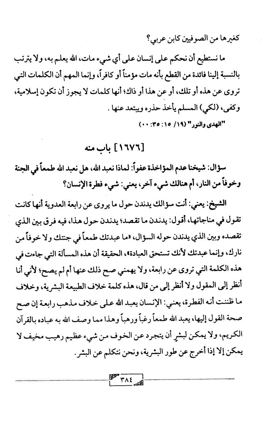 الشيخ: يعني: أنت سؤالك يدندن حول ما يروى عن رابعة العدوية أنها كانت تقول في مناجاتها، أقول: يدندن ما تقصد؛ يدندن حول هذا، فيه فرق بين الذي تقصده وبين الذي يدندن حوله السؤال، «ما عبدتك طمعاً في جنتك ولا خوفاً من نارك، وإنما عبدتك لأنك تستحق العبادة»، الحقيقة أن هذه المسألة التي جاءت في هذه الكلمة التي تروى عن رابعة، ولا يهمني صح ذلك عنها أم لم يصح؛ لأني أنا أنظر إلى المقول ولا أنظر إلى من قال، هذه كلمة خلاف الطبيعة البشرية، وخلاف ما ظننت أنه الفطرة، يعني: الإنسان يعبد الله على خلاف مذهب رابعة إن صح صحة القول إليها، يعبد الله طمعاً رغباً ورهباً وهذا مما وصف الله به عباده بالقرآن الكريم، ولا يمكن لبشرٍ أن يتجرد عن الخوف من شيء عظيم رهيب مخيف لا يمكن إلا إذا أخرج عن طور البشرية، ونحن نتكلم عن البشر.