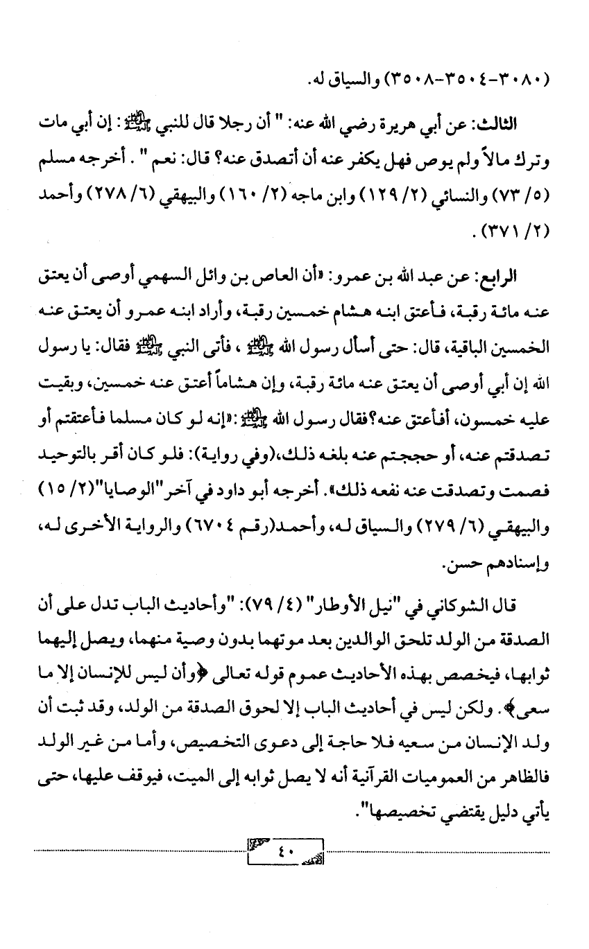 الثالث: عن أبي هريرة رضي الله عنه: " أن رجلا قال للنبي - صلى الله عليه وآله وسلم -: إن أبي مات وترك مالاً ولم يوص فهل يكفر عنه أن أتصدق عنه؟ قال: نعم ". أخرجه مسلم (5/ 73) والنسائي (2/ 129) وابن ماجه (2/ 160) والبيهقي (6/ 278) وأحمد (2/ 371).