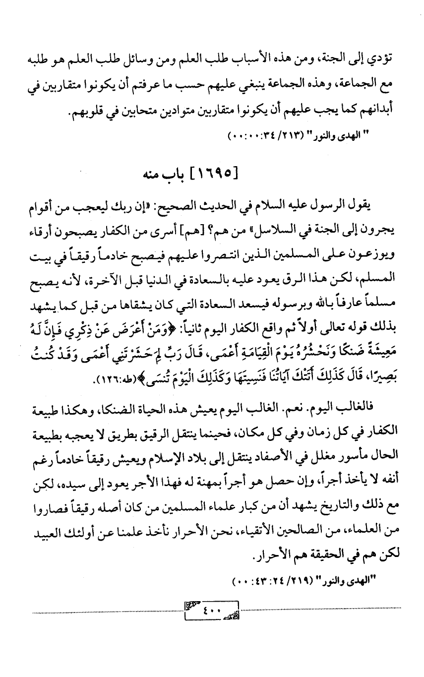 يقول الرسول عليه السلام في الحديث الصحيح: «إن ربك ليعجب من أقوام يجرون إلى الجنة في السلاسل» من هم؟ [هم] أسرى من الكفار يصبحون أرقاء ويوزعون على المسلمين الذين انتصروا عليهم فيصبح خادماً رقيقاً في بيت المسلم، لكن هذا الرق يعود عليه بالسعادة في الدنيا قبل الآخرة، لأنه يصبح مسلماً عارفاً بالله وبرسوله فيسعد السعادة التي كان يشقاها من قبل كما يشهد بذلك قوله تعالى أولاً ثم واقع الكفار اليوم ثانياً: {وَمَنْ أَعْرَضَ عَنْ ذِكْرِي فَإِنَّ لَهُ مَعِيشَةً ضَنكًا وَنَحْشُرُهُ يَوْمَ الْقِيَامَةِ أَعْمَى، قَالَ رَبِّ لِمَ حَشَرْتَنِي أَعْمَى وَقَدْ كُنتُ بَصِيرًا، قَالَ كَذَلِكَ أَتَتْكَ آيَاتُنَا فَنَسِيتَهَا وَكَذَلِكَ الْيَوْمَ تُنسَى} (طه:126).