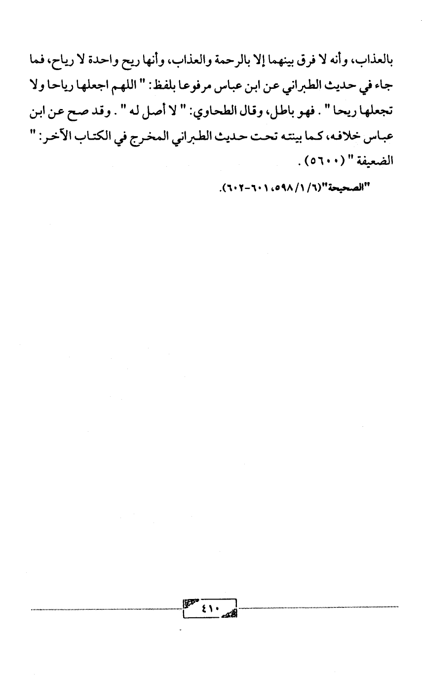 بالعذاب، وأنه لا فرق بينهما إلا بالرحمة والعذاب، وأنها ريح واحدة لا رياح، فما جاء في حديث الطبراني عن ابن عباس مرفوعا بلفظ: " اللهم اجعلها رياحا ولا تجعلها ريحا ". فهو باطل، وقال الطحاوي: " لا أصل له ". وقد صح عن ابن عباس خلافه، كما بينته تحت حديث الطبراني المخرج في الكتاب الآخر: " الضعيفة " (5600).
