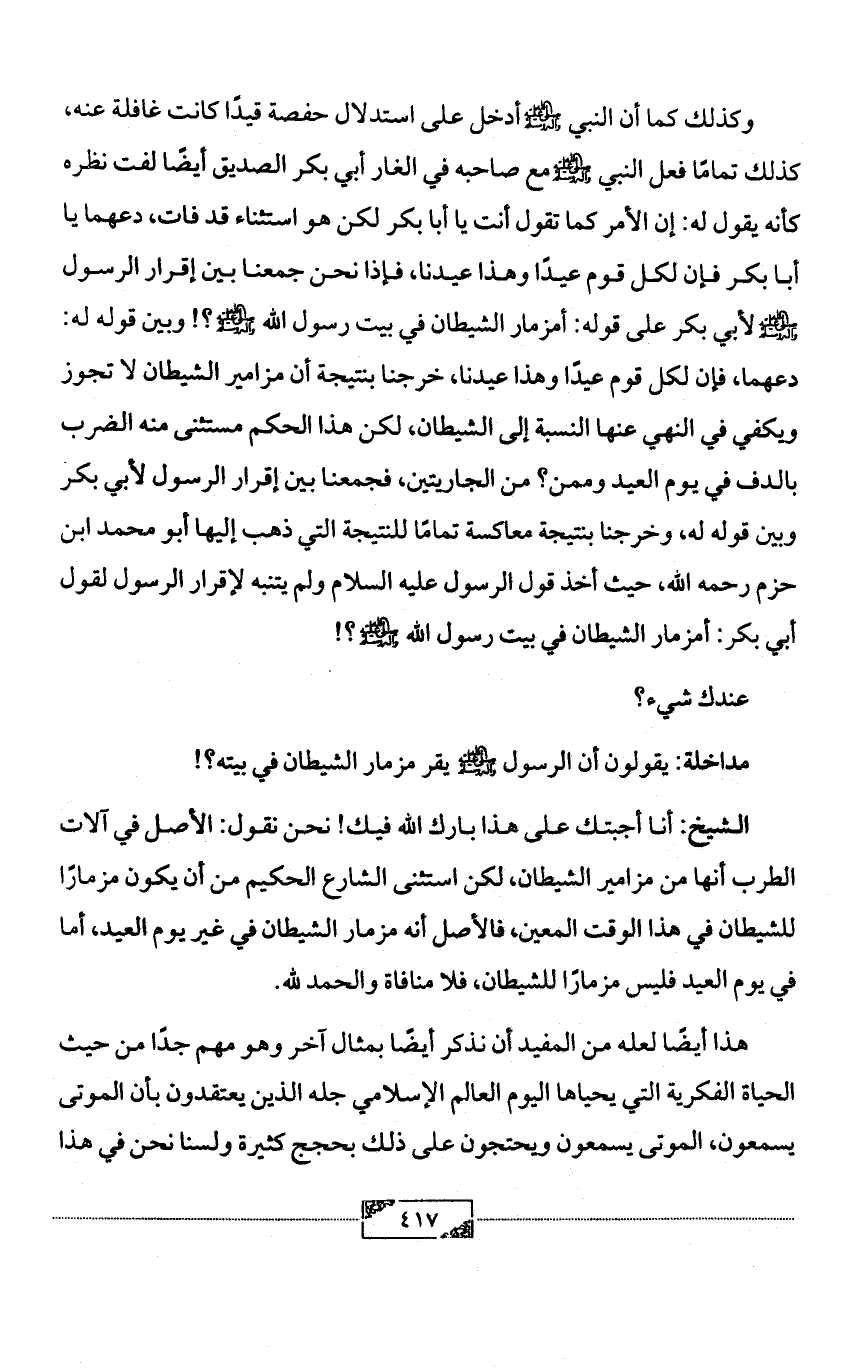 وكذلك كما أن النبي - صلى الله عليه وآله وسلم - أدخل على استدلال حفصة قيدًا كانت غافلة عنه، كذلك تمامًا فعل النبي - صلى الله عليه وآله وسلم - مع صاحبه في الغار أبي بكر الصديق أيضًا لفت نظره كأنه يقول له: إن الأمر كما تقول أنت يا أبا بكر لكن هو استثناء قد فات، دعهما يا أبا بكر فإن لكل قوم عيدًا وهذا عيدنا، فإذا نحن جمعنا بين إقرار الرسول - صلى الله عليه وآله وسلم - لأبي بكر على قوله: أمزمار الشيطان في بيت رسول الله - صلى الله عليه وآله وسلم -؟! وبين قوله له: دعهما، فإن لكل قوم عيدًا وهذا عيدنا، خرجنا بنتيجة أن مزامير الشيطان لا تجوز ويكفي في النهي عنها النسبة إلى الشيطان، لكن هذا الحكم مستثنى منه الضرب بالدف في يوم العيد وممن؟ من الجاريتين، فجمعنا بين إقرار الرسول لأبي بكر وبين قوله له، وخرجنا بنتيجة معاكسة تمامًا للنتيجة التي ذهب إليها أبو محمد ابن حزم رحمه الله، حيث أخذ قول الرسول عليه السلام ولم يتنبه لإقرار الرسول لقول أبي بكر: أمزمار الشيطان في بيت رسول الله - صلى الله عليه وآله وسلم -؟!