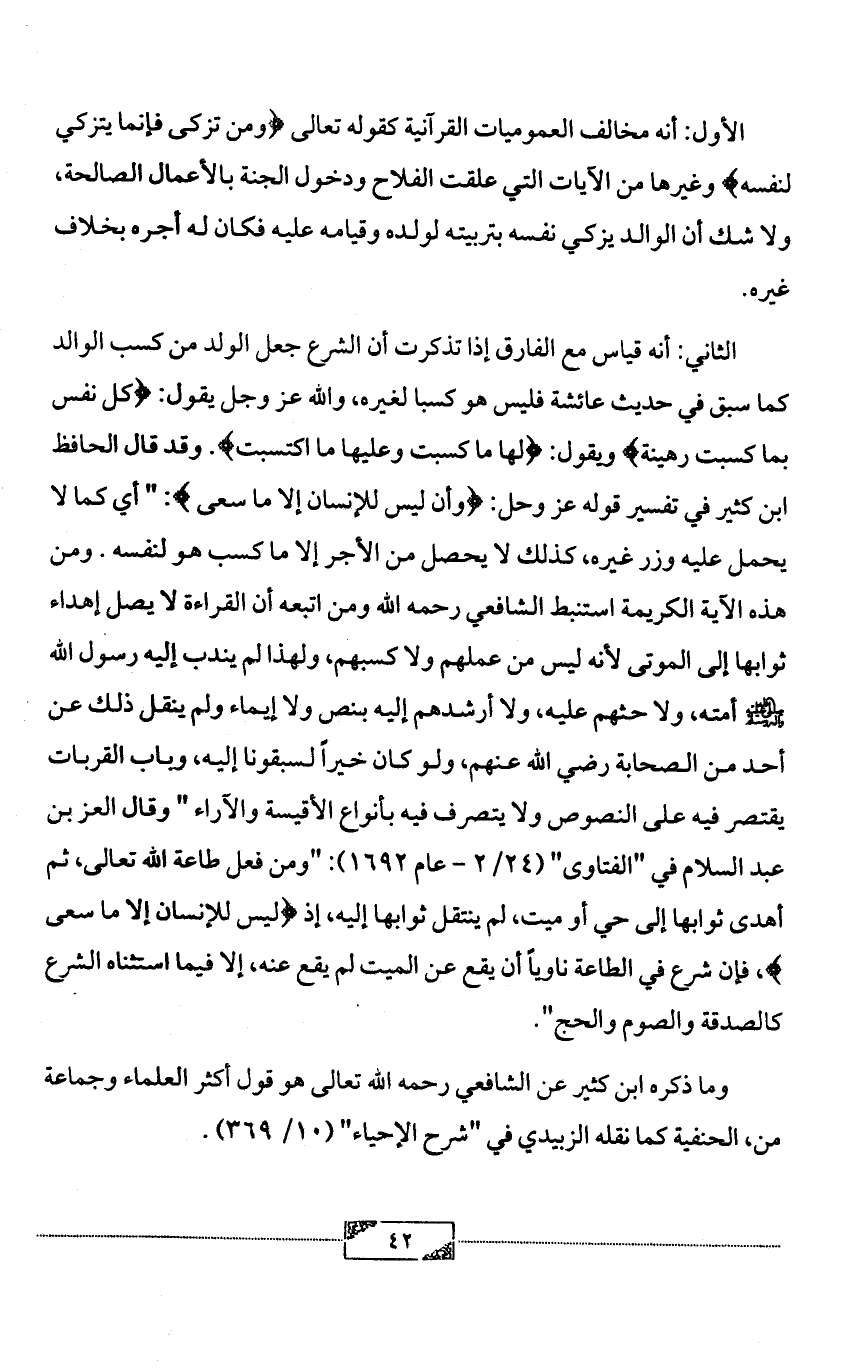 الثاني: أنه قياس مع الفارق إذا تذكرت أن الشرع جعل الولد من كسب الوالد كما سبق في حديث عائشة فليس هو كسبا لغيره، والله عز وجل يقول: {كل نفس بما كسبت رهينة} ويقول: {لها ما كسبت وعليها ما اكتسبت}. وقد قال الحافظ ابن كثير في تفسير قوله عز وحل: {وأن ليس للإنسان إلا ما سعى}: " أي كما لا يحمل عليه وزر غيره، كذلك لا يحصل من الأجر إلا ما كسب هو لنفسه. ومن هذه الآية الكريمة استنبط الشافعي رحمه الله ومن اتبعه أن القراءة لا يصل إهداء ثوابها إلى الموتى لأنه ليس من عملهم ولا كسبهم، ولهذا لم يندب إليه رسول الله - صلى الله عليه وآله وسلم - أمته، ولا حثهم عليه، ولا أرشدهم إليه بنص ولا إيماء ولم ينقل ذلك عن أحد من الصحابة رضي الله عنهم، ولو كان خيراً لسبقونا إليه، وباب القربات يقتصر فيه على النصوص ولا يتصرف فيه بأنواع الأقيسة والآراء " وقال العز بن عبد السلام في "الفتاوى" (24/ 2 - عام 1692): "ومن فعل طاعة الله تعالى، ثم أهدى ثوابها إلى حي أو ميت، لم ينتقل ثوابها إليه، إذ {ليس للإنسان إلا ما سعى}، فإن شرع في الطاعة ناوياً أن يقع عن الميت لم يقع عنه، إلا فيما استثناه الشرع كالصدقة والصوم والحج".