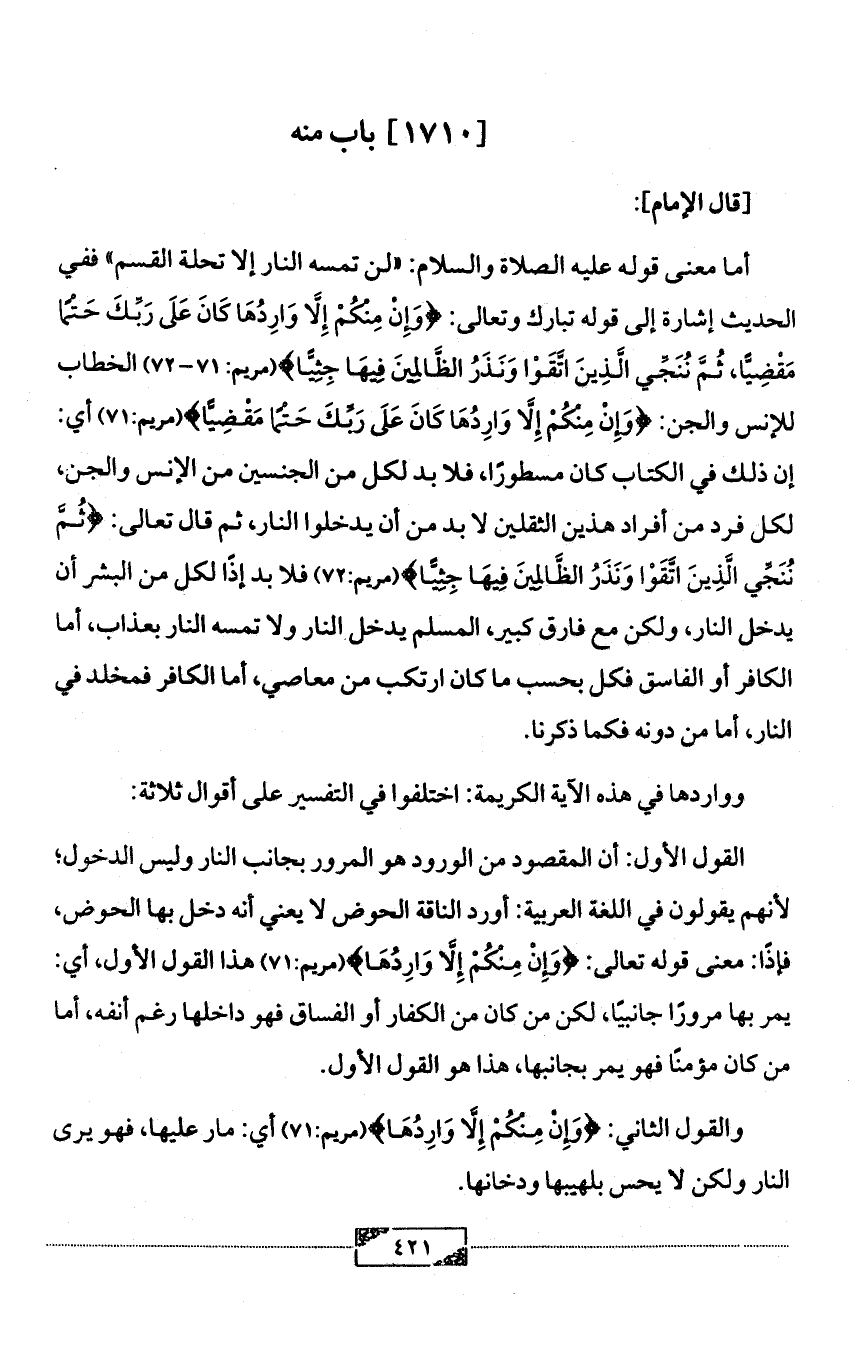 القول الأول: أن المقصود من الورود هو المرور بجانب النار وليس الدخول؛ لأنهم يقولون في اللغة العربية: أورد الناقة الحوض لا يعني أنه دخل بها الحوض، فإذًا: معنى قوله تعالى: {وَإِنْ مِنْكُمْ إِلَّا وَارِدُهَا} (مريم:71) هذا القول الأول، أي: يمر بها مرورًا جانبيًا، لكن من كان من الكفار أو الفساق فهو داخلها رغم أنفه، أما من كان مؤمنًا فهو يمر بجانبها، هذا هو القول الأول.