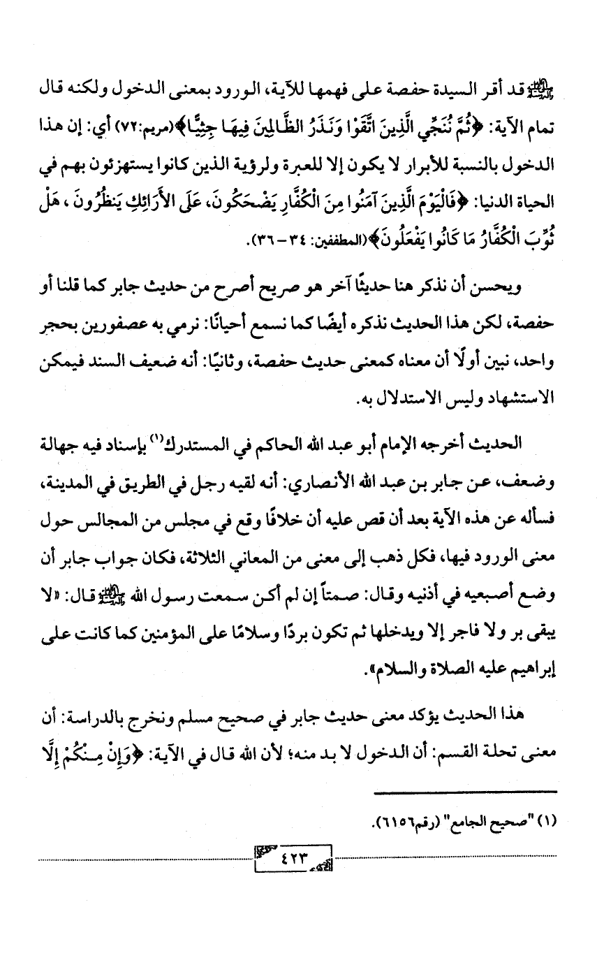 - صلى الله عليه وآله وسلم - قد أقر السيدة حفصة على فهمها للآية، الورود بمعنى الدخول ولكنه قال تمام الآية: {ثُمَّ نُنَجِّي الَّذِينَ اتَّقَوْا وَنَذَرُ الظَّالِمِينَ فِيهَا جِثِيًّا} (مريم:72) أي: إن هذا الدخول بالنسبة للأبرار لا يكون إلا للعبرة ولرؤية الذين كانوا يستهزئون بهم في الحياة الدنيا: {فَالْيَوْمَ الَّذِينَ آمَنُوا مِنَ الْكُفَّارِ يَضْحَكُونَ، عَلَى الأَرَائِكِ يَنظُرُونَ، هَلْ ثُوِّبَ الْكُفَّارُ مَا كَانُوا يَفْعَلُونَ} (المطففين: 34 - 36).