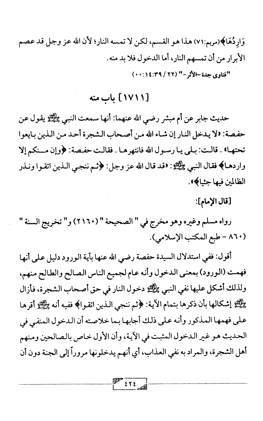 أقول: ففي استدلال السيدة حفصة رضي الله عنها بآية الورود دليل على أنها فهمت (الورود) بمعنى الدخول وأنه عام لجميع الناس الصالح والطالح منهم، ولذلك أشكل عليها نفي النبي - صلى الله عليه وآله وسلم - دخول النار في حق أصحاب الشجرة، فأزال - صلى الله عليه وآله وسلم - إشكالها بأن ذكرها بتمام الآية: {ثم ننجي الذين اتقوا} ففيه أنه - صلى الله عليه وآله وسلم - أقرها على فهمها المذكور وأنه على ذلك أجابها بما خلاصته أن الدخول المنفي في الحديث هو غير الدخول المثبت في الآية، وأن الأول خاص بالصالحين ومنهم أهل الشجرة، والمراد به نفي العذاب، أي أنهم يدخلونها مروراً إلى الجنة دون أن