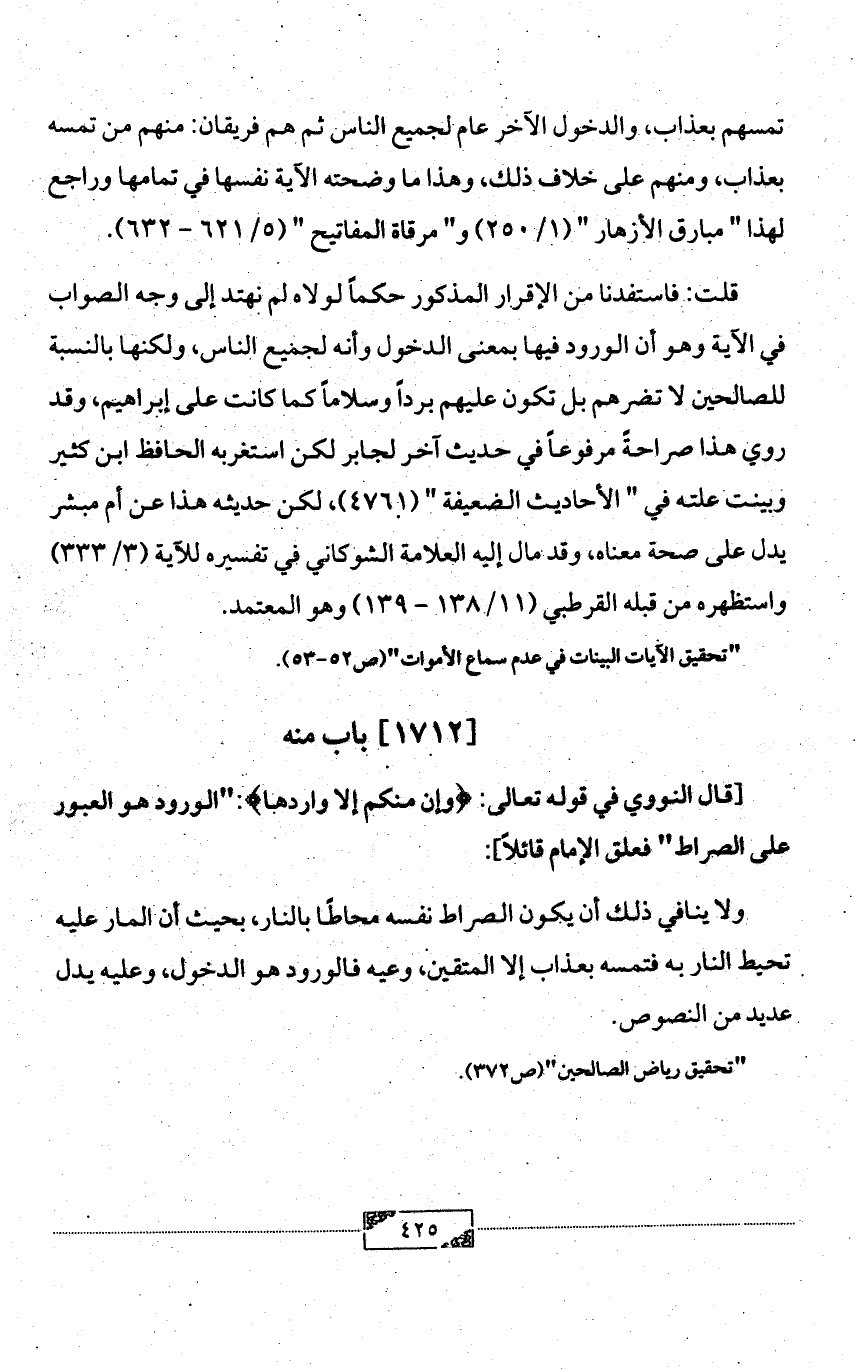 قلت: فاستفدنا من الإقرار المذكور حكماً لولاه لم نهتد إلى وجه الصواب في الآية وهو أن الورود فيها بمعنى الدخول وأنه لجميع الناس، ولكنها بالنسبة للصالحين لا تضرهم بل تكون عليهم برداً وسلاماً كما كانت على إبراهيم، وقد روي هذا صراحةً مرفوعاً في حديث آخر لجابر لكن استغربه الحافظ ابن كثير وبينت علته في " الأحاديث الضعيفة " (4761)، لكن حديثه هذا عن أم مبشر يدل على صحة معناه، وقد مال إليه العلامة الشوكاني في تفسيره للآية (3/ 333) واستظهره من قبله القرطبي (11/ 138 - 139) وهو المعتمد.