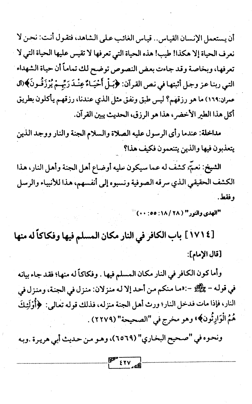 أن يستعمل الإنسان القياس .. قياس الغائب على الشاهد، فتقول أنت: نحن لا نعرف الحياة إلا هكذا! طيب! هذه الحياة التي تعرفها لا تقيس عليها الحياة التي لا تعرفها، وبخاصة وقد جاءت بعض النصوص توضح لك تماماً أن حياة الشهداء التي ربنا عز وجل أثبتها في نص القرآن: {بَلْ أَحْيَاءٌ عِنْدَ رَبِّهِمْ يُرْزَقُونَ} (آل عمران:169) ما هو رزقهم؟ ليس طبق ونفق مثل الذي عندنا، رزقهم يأكلون بطريق أكل هذا الطير الأخضر، هذا هو الرزق، الحديث يبين القرآن.