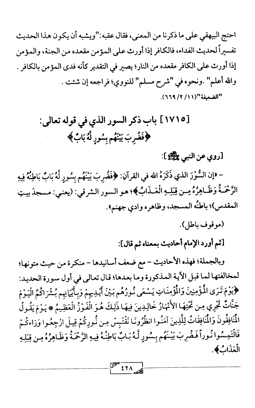 وبالجملة؛ فهذه الأحاديث - مع ضعف أسانيدها - منكرة من حيث متونها؛ لمخالفتها لما قبل الآية المذكورة وما بعدها؛ قال تعالى في أول سورة الحديد: {يَوْمَ تَرَى الْمُؤْمِنِينَ وَالْمُؤْمِنَاتِ يَسْعَى نُورُهُم بَيْنَ أَيْدِيهِمْ وَبِأَيْمَانِهِم بُشْرَاكُمُ الْيَوْمَ جَنَّاتٌ تَجْرِي مِن تَحْتِهَا الأَنْهَارُ خَالِدِينَ فِيهَا ذَلِكَ هُوَ الْفَوْزُ الْعَظِيمُ * يَوْمَ يَقُولُ الْمُنَافِقُونَ وَالْمُنَافِقَاتُ لِلَّذِينَ آمَنُوا انظُرُونَا نَقْتَبِسْ مِن نُّورِكُمْ قِيلَ ارْجِعُوا وَرَاءكُمْ فَالْتَمِسُوا نُوراً فَضُرِبَ بَيْنَهُم بِسُورٍ لَّهُ بَابٌ بَاطِنُهُ فِيهِ الرَّحْمَةُ وَظَاهِرُهُ مِن قِبَلِهِ الْعَذَابُ}.