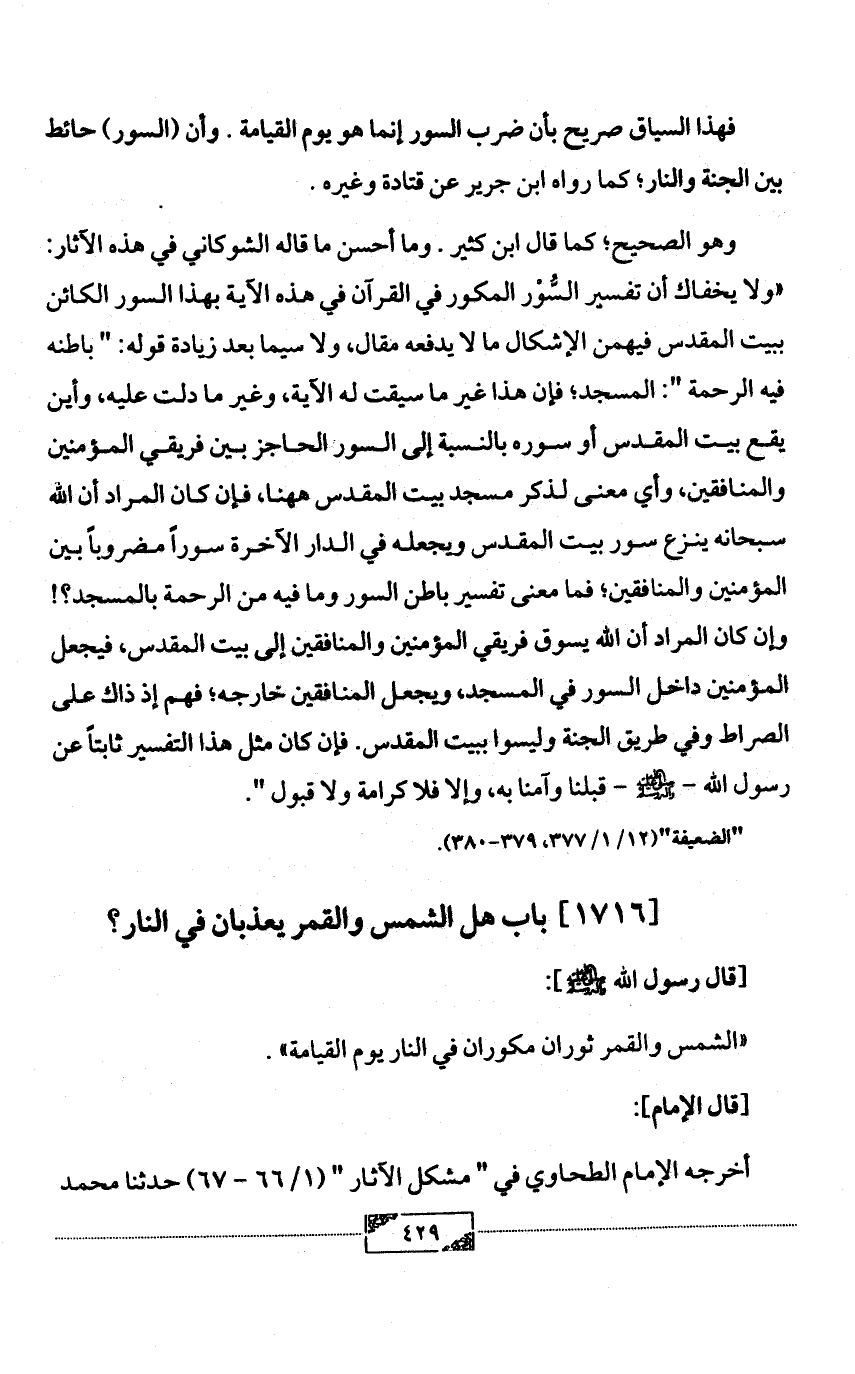 «ولا يخفاك أن تفسير السُّوْر المكور في القرآن في هذه الآية بهذا السور الكائن ببيت المقدس فيهمن الإشكال ما لا يدفعه مقال، ولا سيما بعد زيادة قوله: " باطنه فيه الرحمة ": المسجد؛ فإن هذا غير ما سيقت له الآية، وغير ما دلت عليه، وأين يقع بيت المقدس أو سوره بالنسبة إلى السور الحاجز بين فريقي المؤمنين والمنافقين، وأي معنى لذكر مسجد بيت المقدس ههنا، فإن كان المراد أن الله سبحانه ينزع سور بيت المقدس ويجعله في الدار الآخرة سوراً مضروباً بين المؤمنين والمنافقين؛ فما معنى تفسير باطن السور وما فيه من الرحمة بالمسجد؟! وإن كان المراد أن الله يسوق فريقي المؤمنين والمنافقين إلى بيت المقدس، فيجعل المؤمنين داخل السور في المسجد، ويجعل المنافقين خارجه؛ فهم إذ ذاك على الصراط وفي طريق الجنة وليسوا ببيت المقدس. فإن كان مثل هذا التفسير ثابتاً عن رسول الله - صلى الله عليه وآله وسلم - قبلنا وآمنا به، وإلا فلا كرامة ولا قبول ".