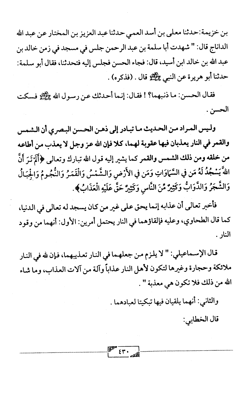 وليس المراد من الحديث ما تبادر إلى ذهن الحسن البصري أن الشمس والقمر في النار يعذبان فيها عقوبة لهما، كلا فإن الله عز وجل لا يعذب من أطاعه من خلقه ومن ذلك الشمس والقمر كما يشير إليه قول الله تبارك وتعالى {أَلَمْ تَرَ أَنَّ اللَّهَ يَسْجُدُ لَهُ مَن في السَّمَاوَاتِ وَمَن في الأَرْضِ وَالشَّمْسُ وَالْقَمَرُ وَالنُّجُومُ وَالْجِبَالُ وَالشَّجَرُ وَالدَّوَابُّ وَكَثِيرٌ مِّنَ النَّاسِ وَكَثِيرٌ حَقَّ عَلَيْهِ الْعَذَابُ}.