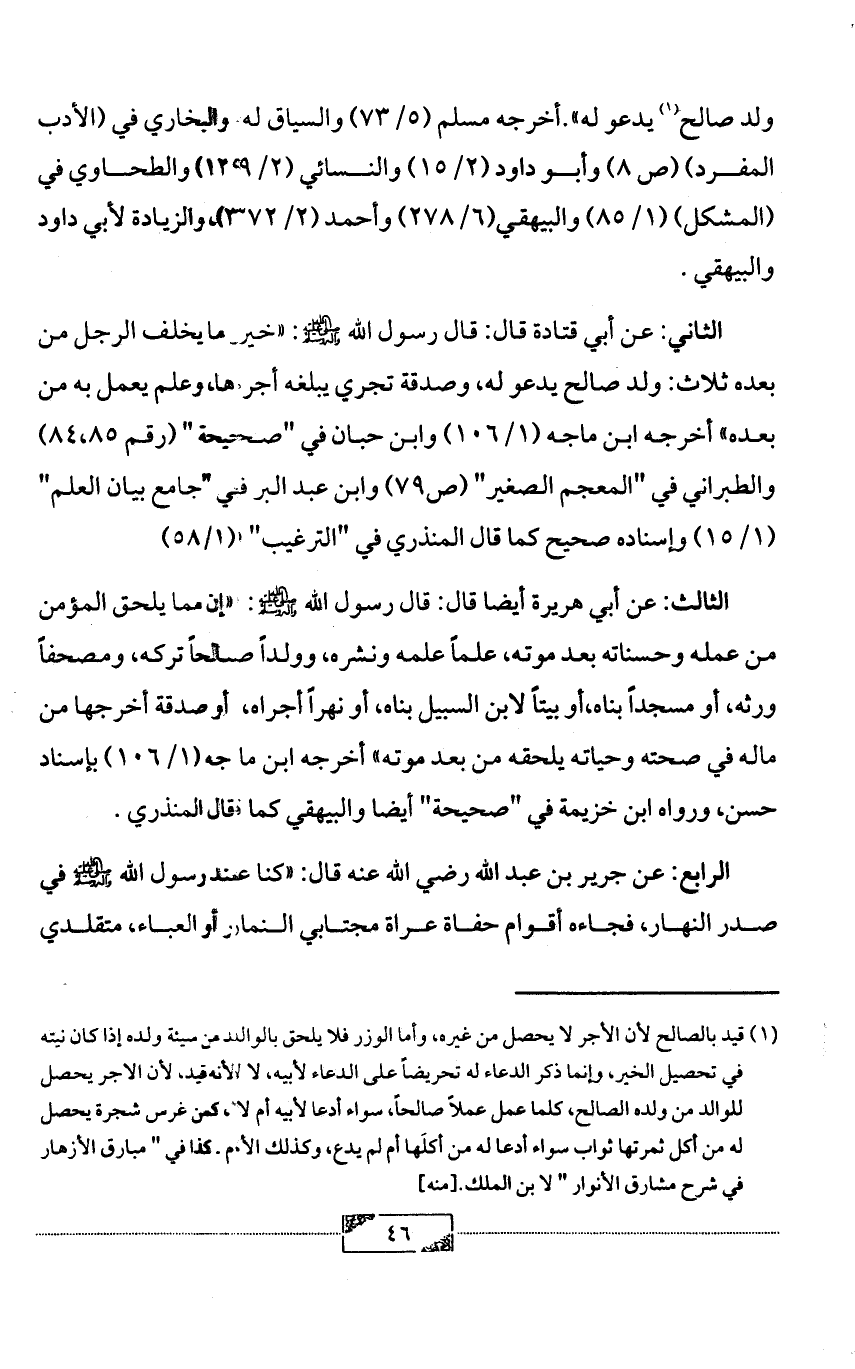 ولد صالح (¬1) يدعو له».أخرجه مسلم (5/ 73) والسياق له والبخاري في (الأدب المفرد) (ص 8) وأبو داود (2/ 15) والنسائي (2/ 129) والطحاوي في (المشكل) (1/ 85) والبيهقي (6/ 278) وأحمد (2/ 372)، والزيادة لأبي داود والبيهقي.