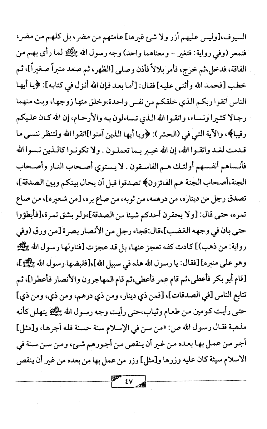 السيوف، [وليس عليهم أزر ولا شئ غيرها] عامتهم من مضر، بل كلهم من مضر، فتمعر (وفي رواية: فتغير - ومعناهما واحد) وجه رسول الله - صلى الله عليه وآله وسلم - لما رأى بهم من الفاقة، فدخل، ثم خرج، فأمر بلالاً فأذن وصلى [الظهر، ثم صعد منبراً صغيراً]، ثم خطب [فحمد الله وأثنى عليه] فقال: [أما بعد فإن الله أنزل في كتابه]: {يا أيها الناس اتقوا ربكم الذي خلقكم من نفس واحدة، وخلق منها زوجها، وبث منهما رجالا كثيرا ونساء، واتقوا الله الذي تساءلون به والأرحام، إن الله كان عليكم رقيبا}، والآية التي في (الحشر): {ويا أيها الذين آمنوا] اتقوا الله ولتنظر ننسى ما قدمت لغد واتقوا الله، إن الله خبير بما تعملون. ولا تكونوا كالذين نسوا الله فأنساهم أنفسهم أولئك هم الفاسقون. لا يستوي أصحاب النار وأصحاب الجنة، أصحاب الجنة هم الفائزون} تصدقوا قبل أن يحال بينكم وبين الصدقة]، تصدق رجل من ديناره، من درهمه، من ثوبه، من صاع بره، [من شعيره]، من صاع تمره، حتى قال: [ولا يحقرن أحدكم شيئا من الصدقة]،ولو بشق تمرة، [فأبطؤوا حتى بان في وجهه الغضب]،قال: فجاء رجل من الأنصار بصرة [من ورق (وفي رواية: من ذهب)] كادت كفه تعجز عنها، بل قد عجزت [فناولها رسول الله - صلى الله عليه وآله وسلم - وهو على منبره] [فقال: يا رسول الله هذه في سبيل الله]، [فقبضها رسول الله - صلى الله عليه وآله وسلم -]، [قام أبو بكر فأعطى، ثم قام عمر فأعطى، ثم قام المهاجرون والأنصار فأعطوا]، ثم تتابع الناس [في الصدقات]، [فمن ذي دينار، ومن ذي درهم، ومن ذي، ومن ذي] حتى رأيت كومين من طعام وثياب، حتى رأيت وجه رسول الله - صلى الله عليه وآله وسلم - يتهلل كأنه مذهبة فقال رسول الله ص: «من سن في الإسلام سنة حسنة فله أجرها، و [مثل] أجر من عمل بها بعده من غير أن ينقص من أجورهم شئ، ومن سن سنة في الاسلام سيئة كان عليه وزرها و [مثل] وزر من عمل بها من بعده من غير أن ينقص