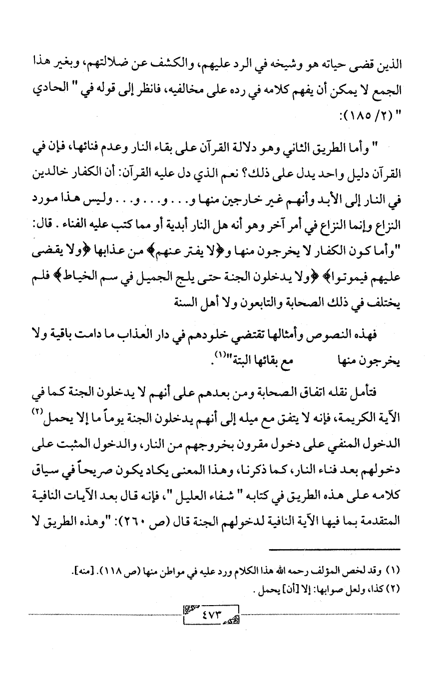 " وأما الطريق الثاني وهو دلالة القرآن على بقاء النار وعدم فنائها، فإن في القرآن دليل واحد يدل على ذلك؟ نعم الذي دل عليه القرآن: أن الكفار خالدين في النار إلى الأبد وأنهم غير خارجين منها و. . . و. . . و. . . وليس هذا مورد النزاع وإنما النزاع في أمر آخر وهو أنه هل النار أبدية أو مما كتب عليه الفناء. قال: