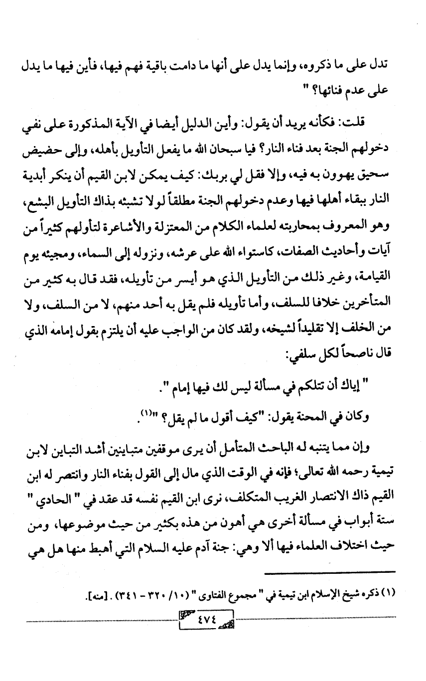 قلت: فكأنه يريد أن يقول: وأين الدليل أيضا في الآية المذكورة على نفي دخولهم الجنة بعد فناء النار؟ فيا سبحان الله ما يفعل التأويل بأهله، وإلى حضيض سحيق يهوون به فيه، وإلا فقل لي بربك: كيف يمكن لابن القيم أن ينكر أبدية النار ببقاء أهلها فيها وعدم دخولهم الجنة مطلقاً لولا تشبثه بذاك التأويل البشع، وهو المعروف بمحاربته لعلماء الكلام من المعتزلة والأشاعرة لتأولهم كثيراً من آيات وأحاديث الصفات، كاستواء الله على عرشه، ونزوله إلى السماء، ومجيئه يوم القيامة، وغير ذلك من التأويل الذي هو أيسر من تأويله، فقد قال به كثير من المتأخرين خلافا للسلف، وأما تأويله فلم يقل به أحد منهم، لا من السلف، ولا من الخلف إلا تقليداً لشيخه، ولقد كان من الواجب عليه أن يلتزم بقول إمامه الذي قال ناصحاً لكل سلفي: