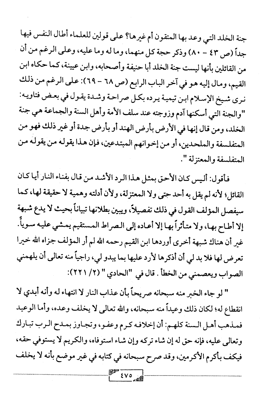 جنة الخلد التي وعد بها المتقون أم غيرها؟ على قولين للعلماء أطال النفس فيها جداً (ص 43 - 80) وذكر حجة كل منهما، وما له وما عليه، وعلى الرغم من أن من القائلين بأنها ليست جنة الخلد أبا حنيفة وأصحابه، وابن عيينة، كما حكاه ابن القيم، ومال إليه هو في آخر الباب الرابع (ص 68 - 69): على الرغم من ذلك نرى شيخ الإسلام ابن تيمية يرده بكل صراحة وشدة يقول في بعض فتاويه: