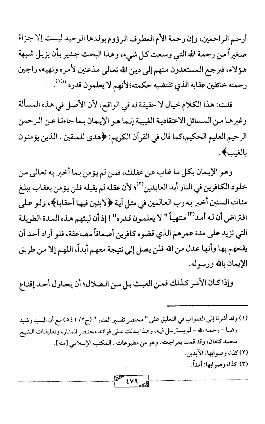 أرحم الراحمين، وإن رحمة الأم العطوف الرؤوم بولدها الوحيد ليست إلا جزاءً صغيراً من رحمة الله التي وسعت كل شيء، وهذا البحث جدير بأن يزيل شبهة هؤلاء، فيرجع المستعدون منهم إلى دين الله تعالى مذعنين لأمره ونهيه، راجين رحمته خائفين عقابه الذي تقتضيه حكمته؛ لأنهم لا يعلمون قدره " (¬1).