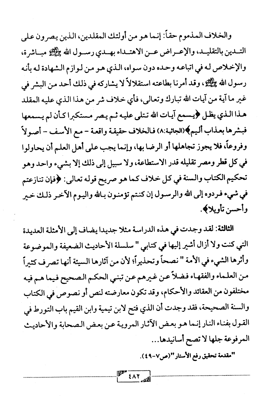 والخلاف المذموم حقاً: إنما هو من أولئك المقلدين، الذين يصرون على التدين بالتقليد، والإعراض عن الاهتداء بهدي رسول الله - صلى الله عليه وآله وسلم - مباشرة، والإخلاص له في اتباعه وحده دون سواه، الذي هو من لوازم الشهادة له بأنه رسول الله - صلى الله عليه وآله وسلم -، وقد أمرنا بطاعته استقلالاً لا يشاركه في ذلك أحد من البشر في غير ما آية من آيات الله تبارك وتعالى، فأي خلاف شر من هذا الذي عليه المقلد هذا الذي يظل {يسمع آيات الله تتلى عليه ثم يصر مستكبرا كأن لم يسمعها فبشرها بعذاب أليم} (الجاثية:8) فالخلاف حقيقة واقعة - مع الأسف - أصولاً وفروعاً، فلا يجوز تجاهلها أو الرضا بها، وإنما يجب على أهل العلم أن يحاولوا في كل قطر ومصر تقليله قدر الاستطاعة، ولا سبيل إلى ذلك إلا بشيء واحد وهو تحكيم الكتاب والسنة في كل خلاف كما هو صريح قوله تعالى: {فإن تنازعتم في شيء فردوه إلى الله والرسول إن كنتم تؤمنون بالله واليوم الآخر ذلك خير وأحسن تأويلا}.