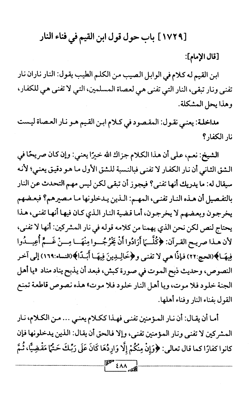 الشيخ: نعم، على أن هذا الكلام جزاك الله خيرًا يعني: وإن كان صريحًا في الشق الثاني أن نار الكفار لا تفنى فبالنسبة للشق الأول ما هو دقيق يعني؛ لأنه سيقال له: ما يدريك أنها تفنى؟ فيجوز أن تبقى لكن ليس مهم التحدث عن النار بالتفصيل أن هذه النار تفنى، المهم: الذين يدخلونها ما مصيرهم؟ فبعضهم يخرجون وبعضهم لا يخرجون، أما قضية النار الذي كان فيها أنها تفنى، هذا يحتاج لنص لكن نحن الذي يهمنا من كلامه قوله في نار المشركين: أنها لا تفنى، لأن هذا صريح القرآن: {كُلَّمَا أَرَادُوا أَنْ يَخْرُجُوا مِنْهَا مِنْ غَمٍّ أُعِيدُوا فِيهَا} (الحج:22) فإذًا هي لا تفنى و {خَالِدِينَ فِيهَا أَبَدًا} (النساء:169) إلى آخر النصوص، وحديث ذبح الموت في صورة كبش، فبعد أن يذبح يناد مناد «يا أهل الجنة خلود فلا موت، ويا أهل النار خلود فلا موت» هذه نصوص قاطعة تمنع القول بفناء النار وفناء أهلها.