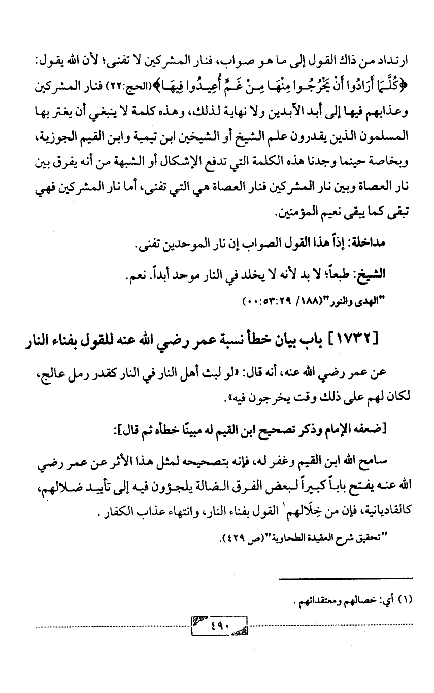 ارتداد من ذاك القول إلى ما هو صواب، فنار المشركين لا تفنى؛ لأن الله يقول: {كُلَّمَا أَرَادُوا أَنْ يَخْرُجُوا مِنْهَا مِنْ غَمٍّ أُعِيدُوا فِيهَا} (الحج:22) فنار المشركين وعذابهم فيها إلى أبد الآبدين ولا نهاية لذلك، وهذه كلمة لا ينبغي أن يغتر بها المسلمون الذين يقدرون علم الشيخ أو الشيخين ابن تيمية وابن القيم الجوزية، وبخاصة حينما وجدنا هذه الكلمة التي تدفع الإشكال أو الشبهة من أنه يفرق بين نار العصاة وبين نار المشركين فنار العصاة هي التي تفنى، أما نار المشركين فهي تبقى كما يبقى نعيم المؤمنين.