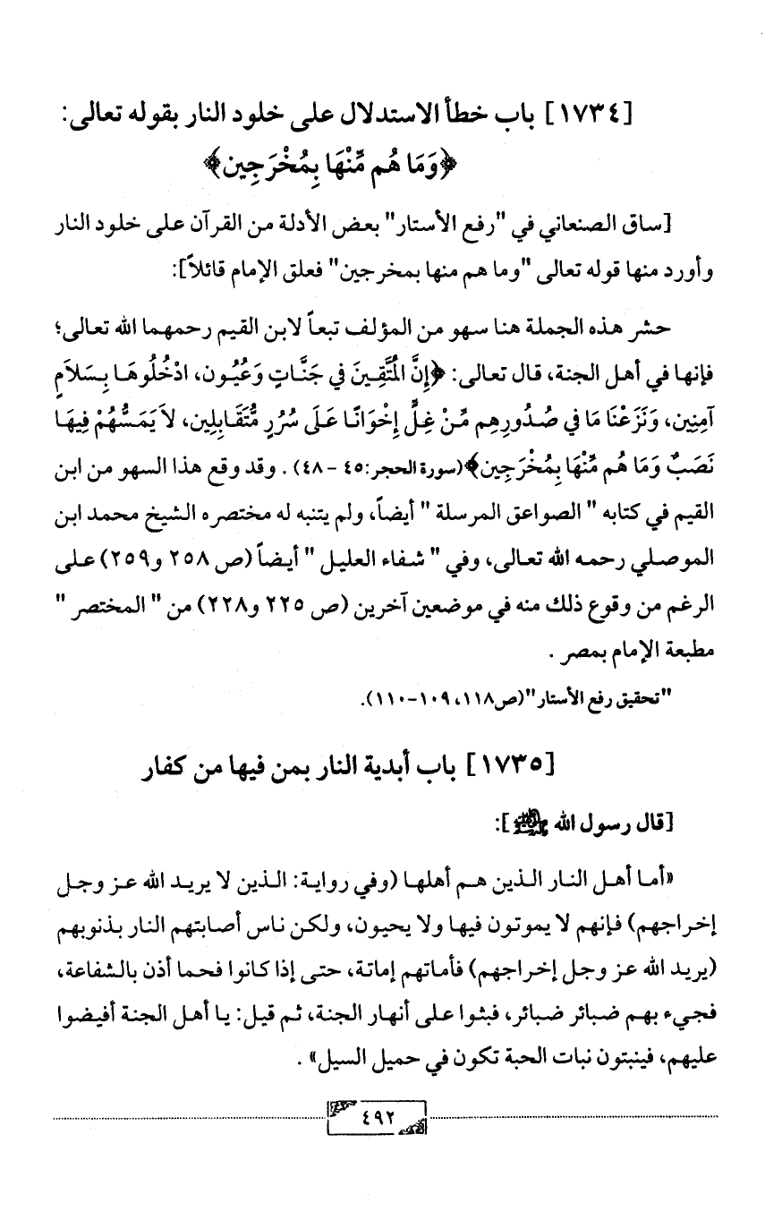 [ساق الصنعاني في "رفع الأستار" بعض الأدلة من القرآن على خلود النار وأورد منها قوله تعالى "وما هم منها بمخرجين" فعلق الإمام قائلاً]:
