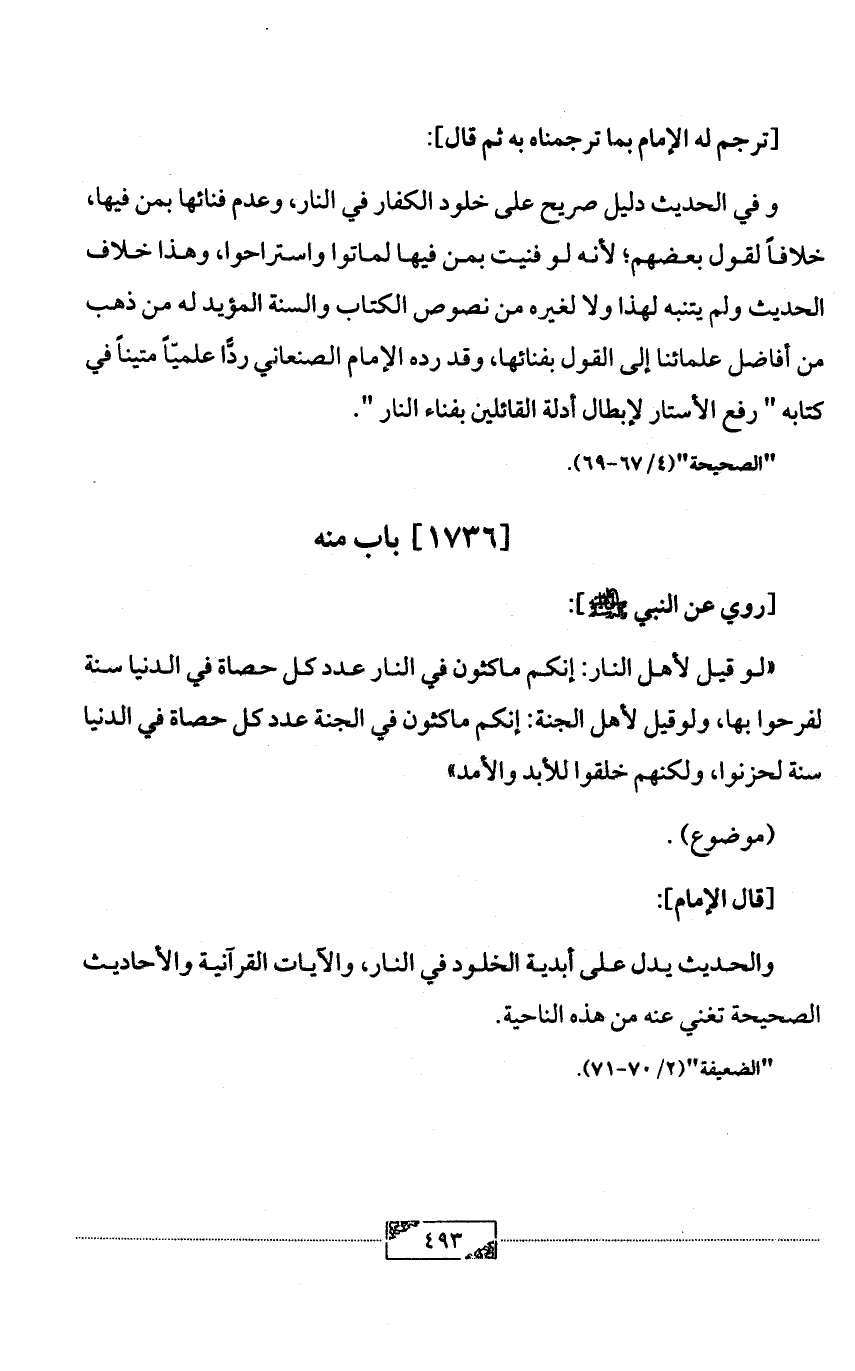وفي الحديث دليل صريح على خلود الكفار في النار، وعدم فنائها بمن فيها، خلافاً لقول بعضهم؛ لأنه لو فنيت بمن فيها لماتوا واستراحوا، وهذا خلاف الحديث ولم يتنبه لهذا ولا لغيره من نصوص الكتاب والسنة المؤيد له من ذهب من أفاضل علمائنا إلى القول بفنائها، وقد رده الإمام الصنعاني ردًّا علميّاً متيناً في كتابه " رفع الأستار لإبطال أدلة القائلين بفناء النار ".