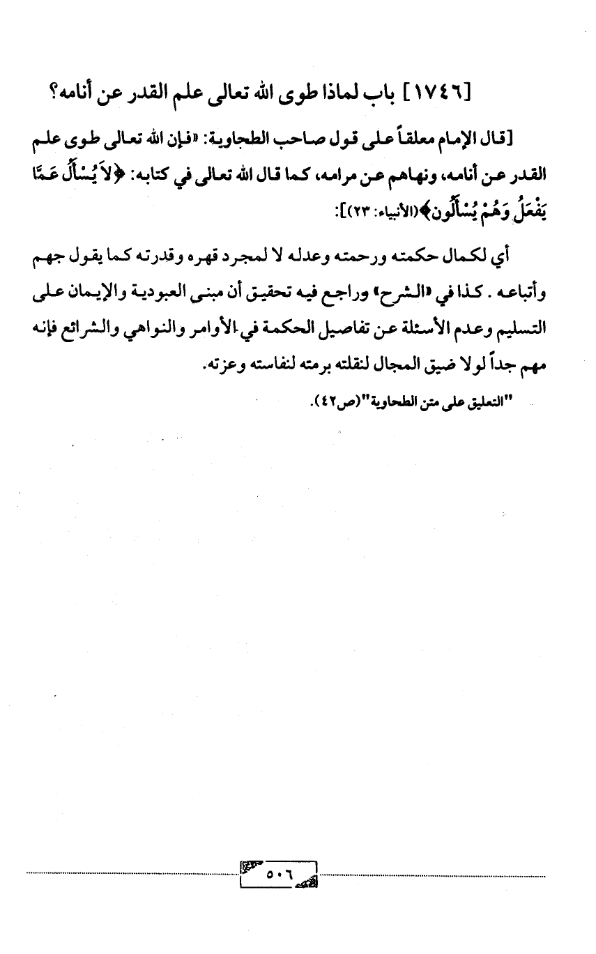 [قال الإمام معلقاً على قول صاحب الطحاوية: «فإن الله تعالى طوى علم القدر عن أنامه، ونهاهم عن مرامه، كما قال الله تعالى في كتابه: {لاَ يُسْأَلُ عَمَّا يَفْعَلُ وَهُمْ يُسْأَلُون} (الأنبياء: 23)]: