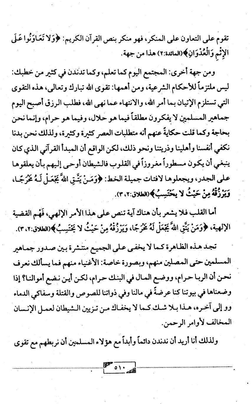 ومن جهة أخرى: المجتمع اليوم كما تعلم، وكما تدندن في كثير من خطبك: ليس ملتزماً للأحكام الشرعية، ومن أهمها: تقوى الله تبارك وتعالى، هذه التقوى التي تستلزم الإتيان بما أمر الله، والانتهاء عما نهى الله، فطلب الرزق أصبح اليوم جماهير المسلمين لا يفكرون مطلقاً فيما هو حلال، وفيما هو حرام، وإنما نحن بحاجة وكما قلت حكايةً عنهم أنه متطلبات العصر كثيرة وكثيرة، ولذلك نحن بدنا نكفي أنفسنا وأهلينا وذريتنا ونحو ذلك، لكن الواقع أن المبدأ القرآني الذي كان ينبغي أن يكون مسطوراً مغروزاً في القلوب فالشيطان أوحى إليهم بأن يعلقوها على الجدر، ويجعلوها لافتات جميلة الخط: {وَمَنْ يَتَّقِ اللَّهَ يَجْعَلْ لَهُ مَخْرَجًا، وَيَرْزُقْهُ مِنْ حَيْثُ لا يَحْتَسِبُ} (الطلاق:2، 3).