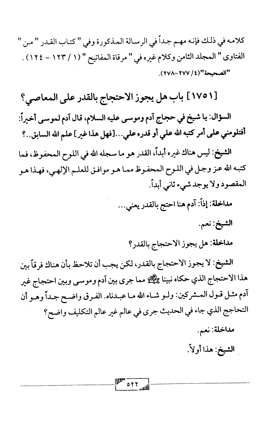 الشيخ: لا يجوز الاحتجاج بالقدر، لكن يجب أن تلاحظ بأن هناك فرقاً بين هذا الاحتجاج الذي حكاه نبينا - صلى الله عليه وآله وسلم - مما جرى بين آدم وموسى وبين احتجاج غير آدم مثل قول المشركين: ولو شاء الله ما عبدناه. الفرق واضح جداً وهو أن التحاجج الذي جاء في الحديث جرى في عالم غير عالم التكليف واضح؟