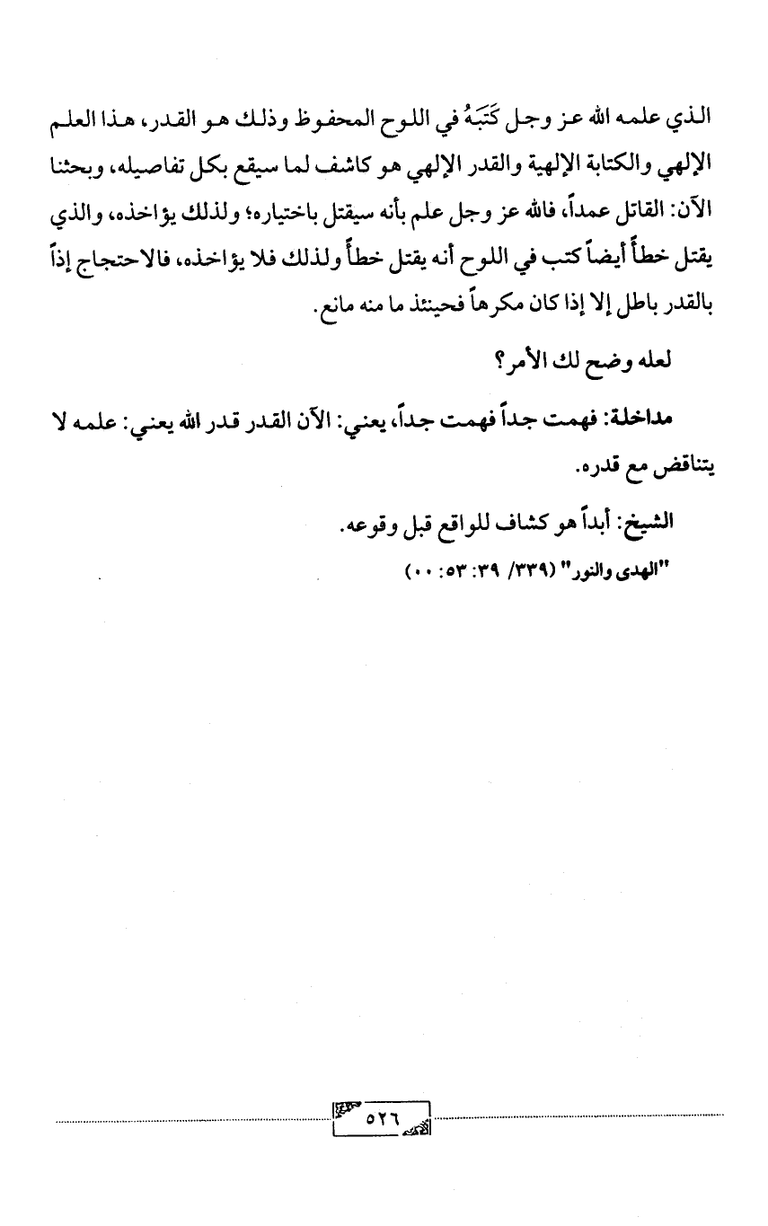 مداخلة: فهمت جداً فهمت جداً، يعني: الآن القدر قدر الله يعني: علمه لا يتناقض مع قدره.
