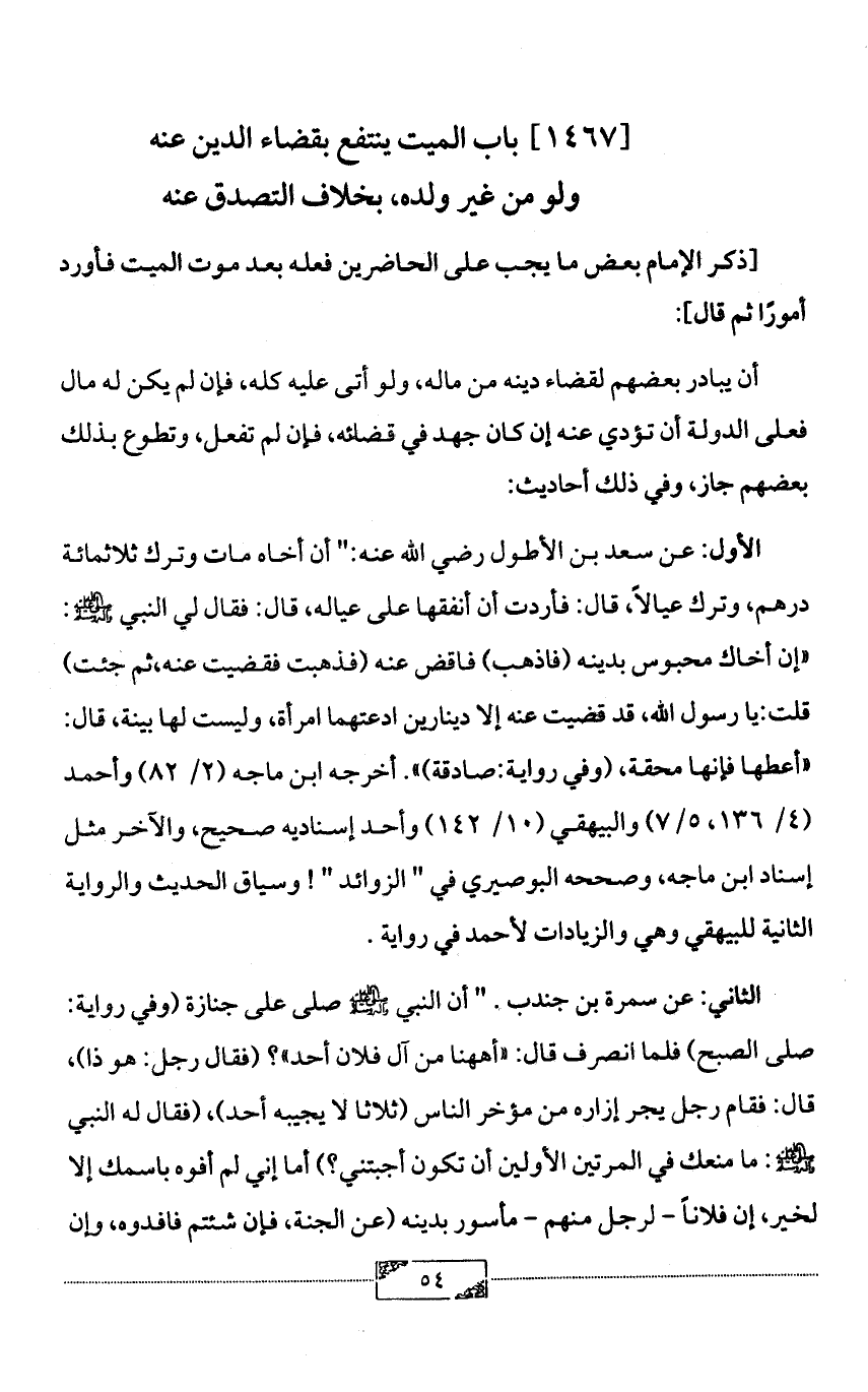 الأول: عن سعد بن الأطول رضي الله عنه:" أن أخاه مات وترك ثلاثمائة درهم، وترك عيالاً، قال: فأردت أن أنفقها على عياله، قال: فقال لي النبي - صلى الله عليه وآله وسلم -: «إن أخاك محبوس بدينه (فاذهب) فاقض عنه (فذهبت فقضيت عنه، ثم جئت) قلت: يا رسول الله، قد قضيت عنه إلا دينارين ادعتهما امرأة، وليست لها بينة، قال: «أعطها فإنها محقة، (وفي رواية: صادقة)». أخرجه ابن ماجه (2/ 82) وأحمد (4/ 136، 5/ 7) والبيهقي (10/ 142) وأحد إسناديه صحيح، والآخر مثل إسناد ابن ماجه، وصححه البوصيري في " الزوائد "! وسياق الحديث والرواية الثانية للبيهقي وهي والزيادات لأحمد في رواية.