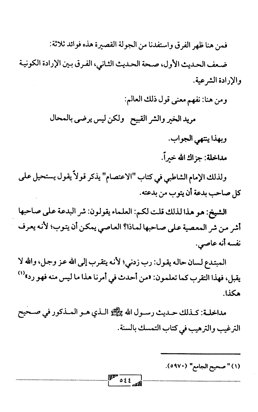 مداخلة: كذلك حديث رسول الله - صلى الله عليه وآله وسلم - الذي هو المذكور في صحيح الترغيب والترهيب في كتاب التمسك بالسنة.