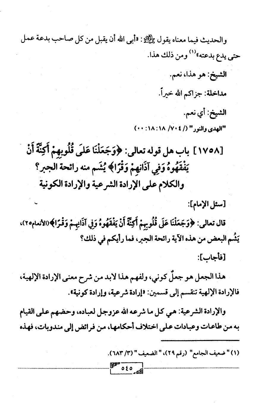 [1758] باب هل قوله تعالى: {وَجَعَلْنَا عَلَى قُلُوبِهِمْ أَكِنَّةً أَنْ يَفْقَهُوهُ وَفِي آذَانِهِمْ وَقْرًا} يُشَم منه رائحة الجبر؟ والكلام على الإرادة الشرعية والإرادة الكونية