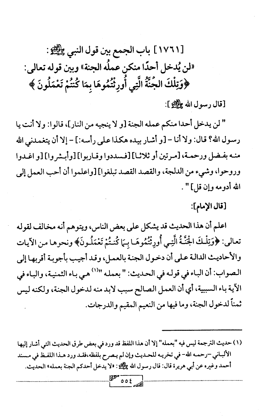 (¬1) حديث الترجمة ليس فيه "بعمله" إلا أن هذا اللفظ قد ورد في بعض طرق الحديث التي أشار إليها الألباني -رحمه الله- في تخريه للحديث وإن لم يصرح بلفظه، فقد ورد هذا اللفظ في مسند