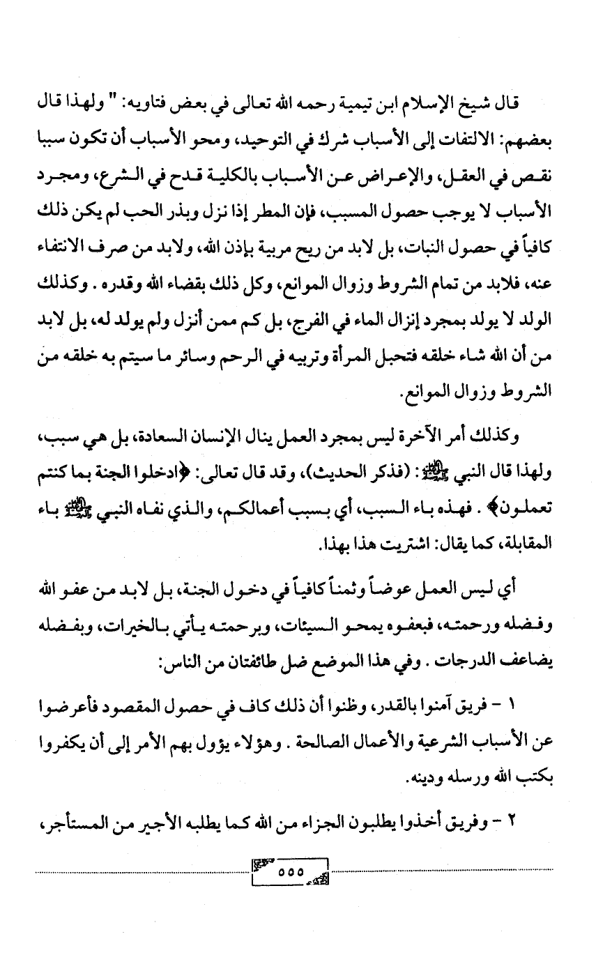 وكذلك أمر الآخرة ليس بمجرد العمل ينال الإنسان السعادة، بل هي سبب، ولهذا قال النبي - صلى الله عليه وآله وسلم -: (فذكر الحديث)، وقد قال تعالى: {ادخلوا الجنة بما كنتم تعملون}. فهذه باء السبب، أي بسبب أعمالكم، والذي نفاه النبي - صلى الله عليه وآله وسلم - باء المقابلة، كما يقال: اشتريت هذا بهذا.