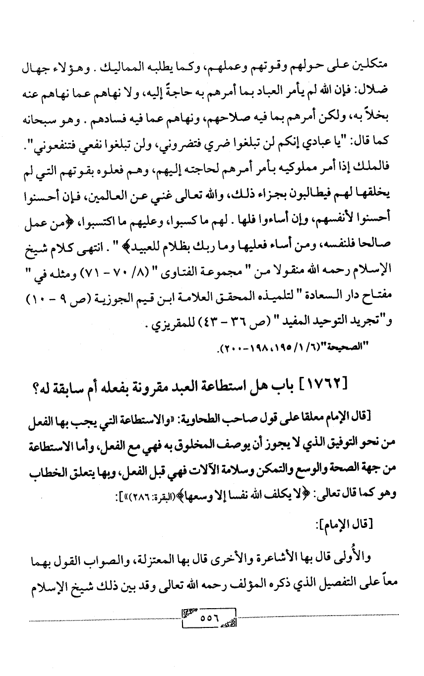 [قال الإمام معلقا على قول صاحب الطحاوية: «والاستطاعة التي يجب بها الفعل من نحو التوفيق الذي لا يجوز أن يوصف المخلوق به فهي مع الفعل، وأما الاستطاعة من جهة الصحة والوسع والتمكن وسلامة الآلات فهي قبل الفعل، وبها يتعلق الخطاب وهو كما قال تعالى: {لا يكلف الله نفسا إلا وسعها} (البقرة: 286)»]: